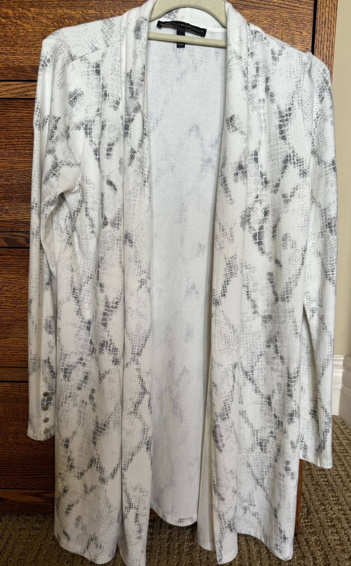 Beautiful gray light cream cardigan by White House Black Market. Long sleeves with silver tone buttons. Is roomy but not oversized. Will be able to dress up or down or wear during cool summer nights. Can also use as a swim cover up or bathrobe. Unique pattern small with grey modern looking squares. Super cute. New never worn without tags