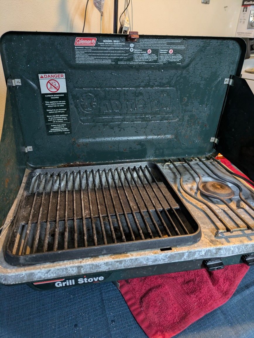 I have a used Coleman propane grill stove model number 9921 this is one of their better models it's a very nice little stove it works properly everything's in order it's got a little rust not too bad from sitting around I guess but it doesn't affect anything it's ready to go it just need some propane I got a bottle of propane I could sell with it but our add to it so that'll be fine it doesn't need charcoals or anything just your regular oil propane I'm asking $45 for it they go for at least twice that much plus but that's brand new so it ain't go running about a hundred bucks anyway I live in Lakewood and I'm willing to negotiate a little bit and I deliver it if I need be if it's close