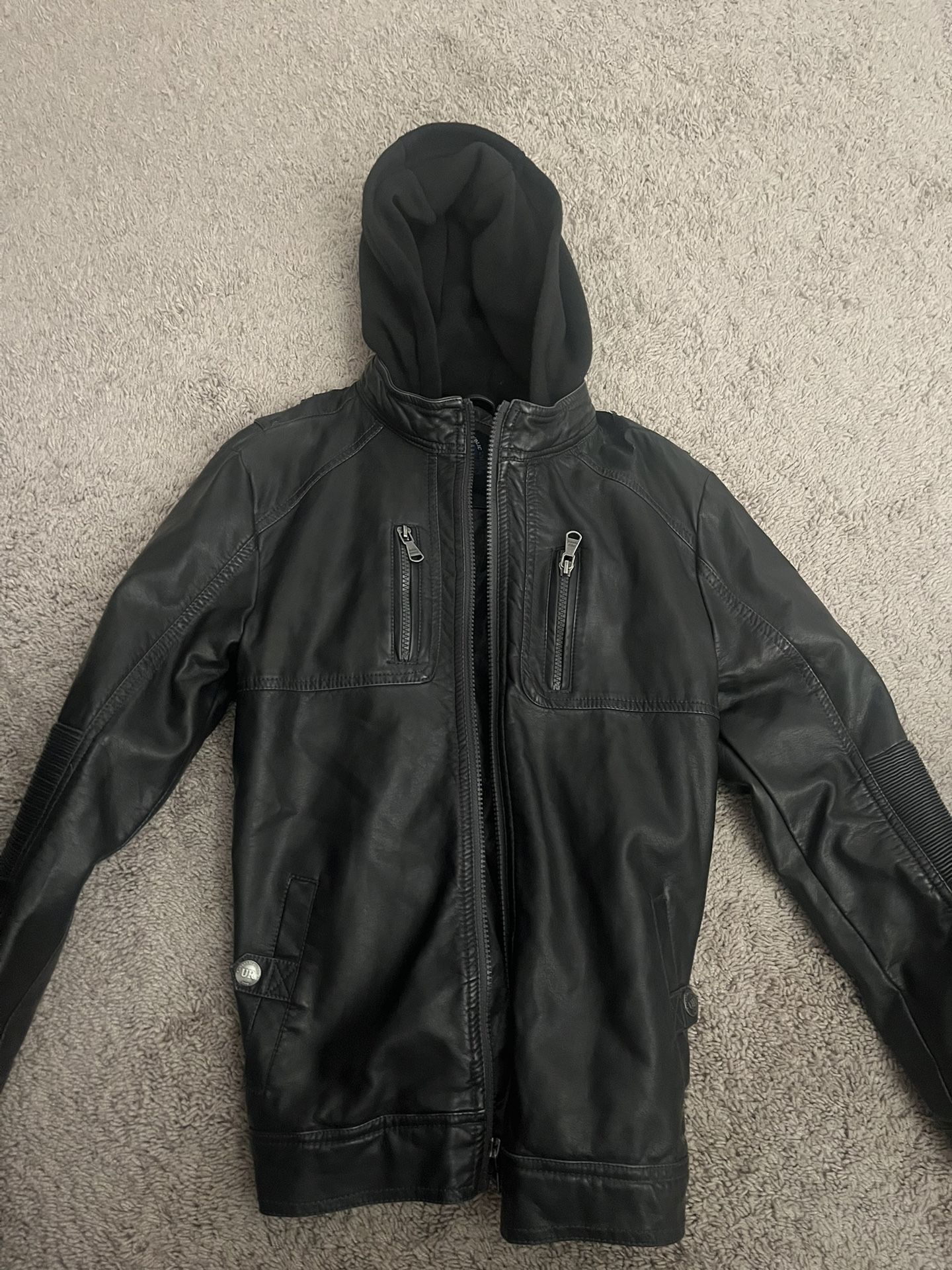 Youth size Large 14/16. Good leather jacket with fleece hoodie