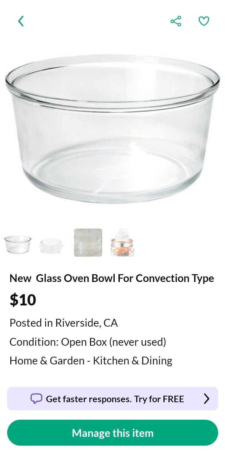 I am not selling an oven, just the bowl it comes with, so if you need a replacement, save some real cash & buy this! Made to withstand extreme hot temp. Purchased new ovens for the lid & always use my old bowl. This is a new bowl for most infrared halogen convection ovens. ( See last picture) Have a few of these. Made of borosilicate glass. This type of glass is known for its high heat resistance and is suitable for use in cooking and appliances. Borosilicate glass is also used in other kitchen items like glass mixing bowls. Here's why borosilicate glass is a good choice for these bowls: Heat Resistance: Borosilicate glass can withstand high temperatures, making it suitable for convection oven roasting. Durability: It's more durable than regular glass, less likely to crack or shatter when exposed to heat. Food Safety: It's non-reactive with food, so it doesn't impart any flavors or contaminants. Easy Cleaning: Borosilicate glass is typically easy to clean, often dishwasher safe. Please ck out my other posts in my profile. Thank you.