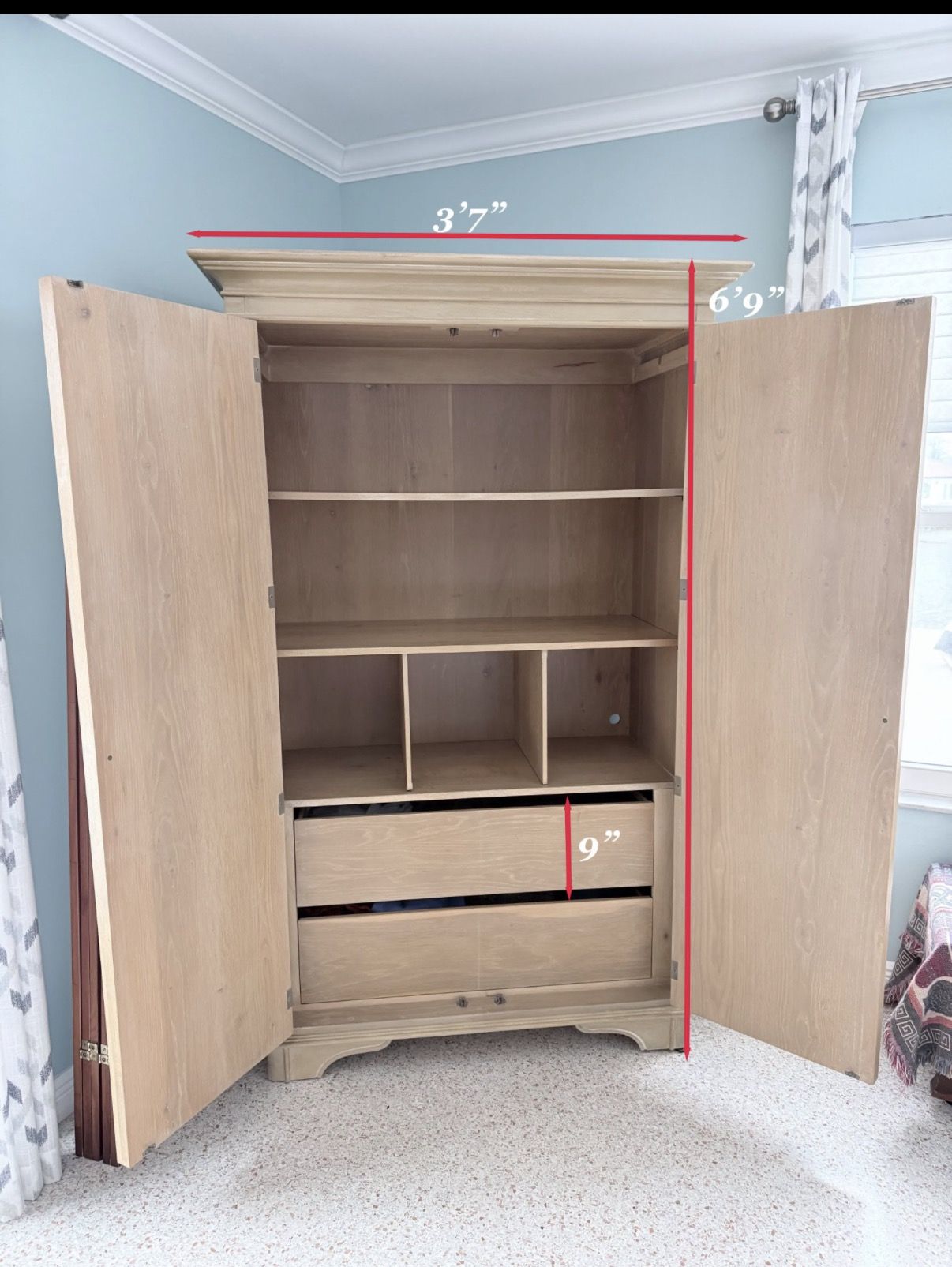 Grand Armoire was made by Bernhardt's. Transitional style has a simplistic profile with minimal details and softened edges. The armoire features oak veneers with subtle strokes of gray color in the grain that creates a decorative pattern on the paneled doors. The light tan hued stain is complemented with bold oval hardware in an antique brass finish. The cabinet has 2 doors, the spacious interior provides plenty of storage space with adjustable shelf and two sizable drawer. There is an outlet and a cutout opening on the back for media device cord management. Overall Dimensions: 43" W, 26" D, 82" H Interior Dimensions: Shelfs: 36" W, 10.5" D Drawer: 36" W,10.’: D, 9" H excellent condition. No signs of aging or fading on exterior and interior surfaces.