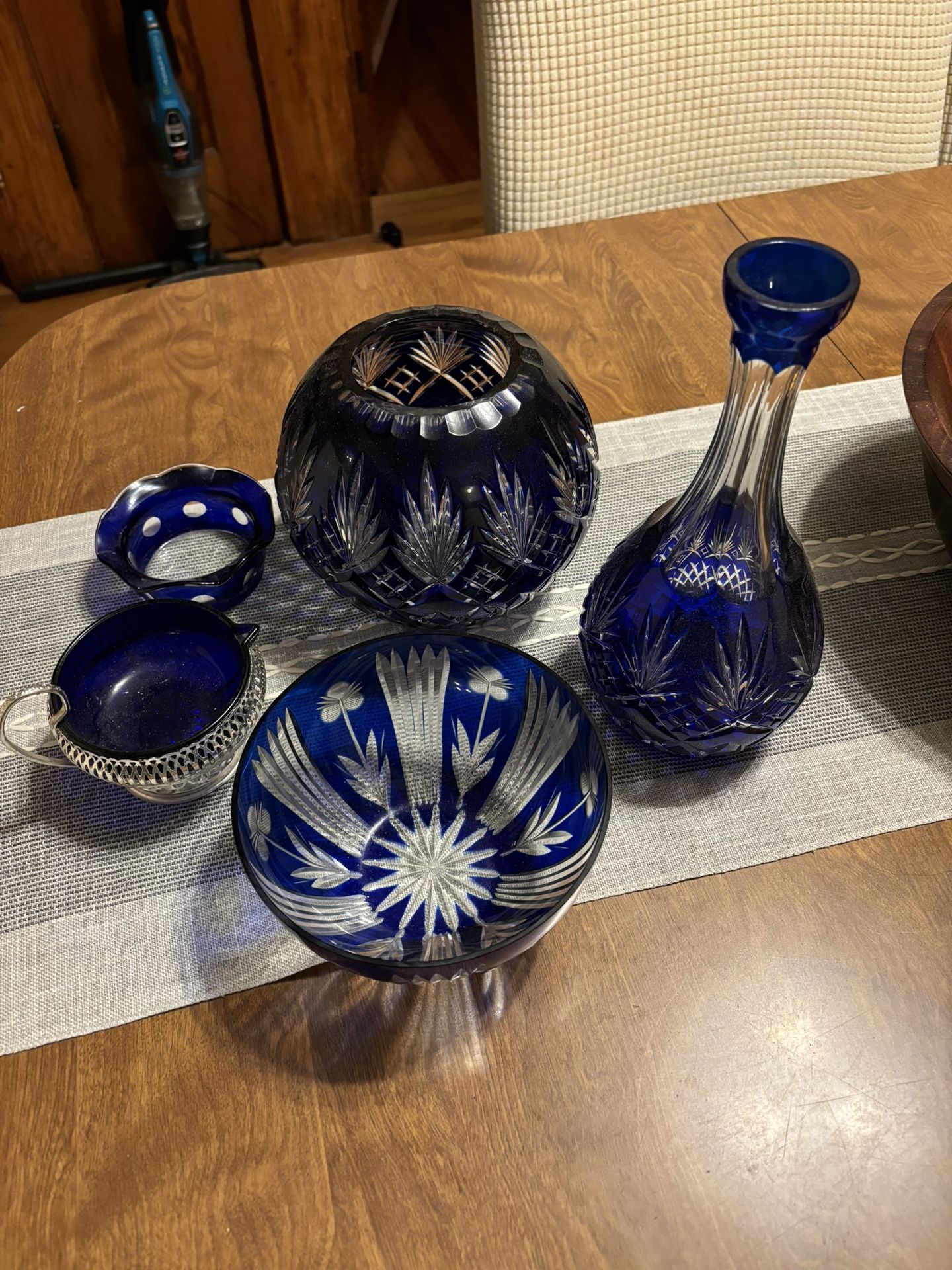 This is an absolutely beautiful set of cobalt blue cut crystal that was given to me by my father. I hate to part with it but I am in need of money for unexpected expenses. I hope someone can enjoy it as i have. Will insure.