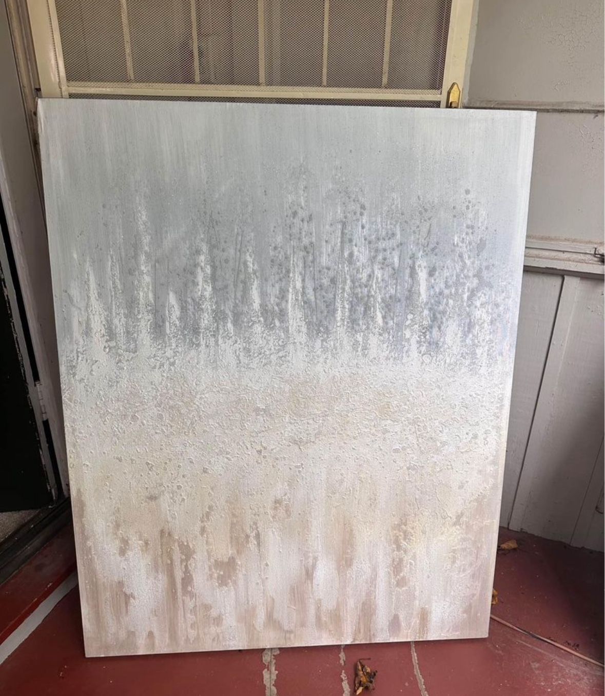 Excellent condition, beautiful large contemporary abstract painting for sale. 40” by 50” can be hung horizontal or vertical, there is already wire on the back to hang up easily or you can use command strips. Great neutral colors- gold, gray/ blue, silver with metallic sheen and some glitter. Paid $300 originally, had it for about a year Located in Dallas 75211