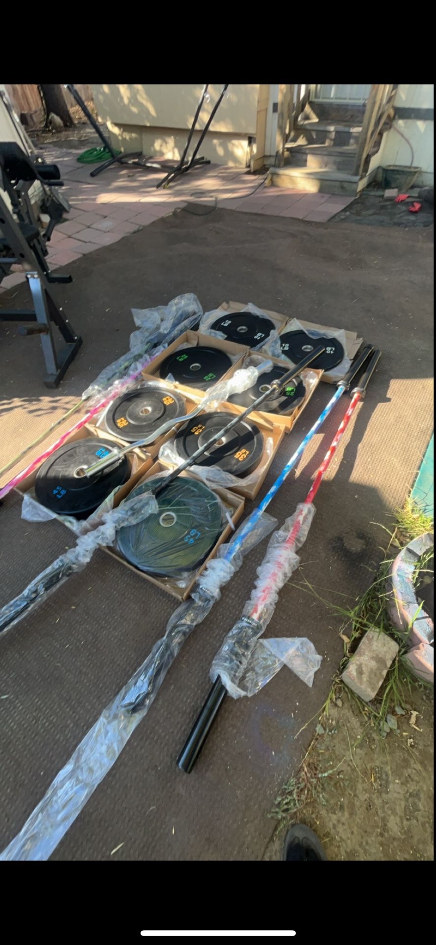 Brand new in box 230lb bumper set-$265 Brand new in box 260lb bumper set-$300 Brand new in box 5-50 complete dumbbell set-$650 Brand new in box Camouflage Olympic barbell-$150 Brand new in box 245lb cast iron complete set-$285 Brand new in box Olympic curl bar-$40 Brand new in box plain Olympic 100lb bumper set 4-25s-$100 Pickup downtown San Jose
