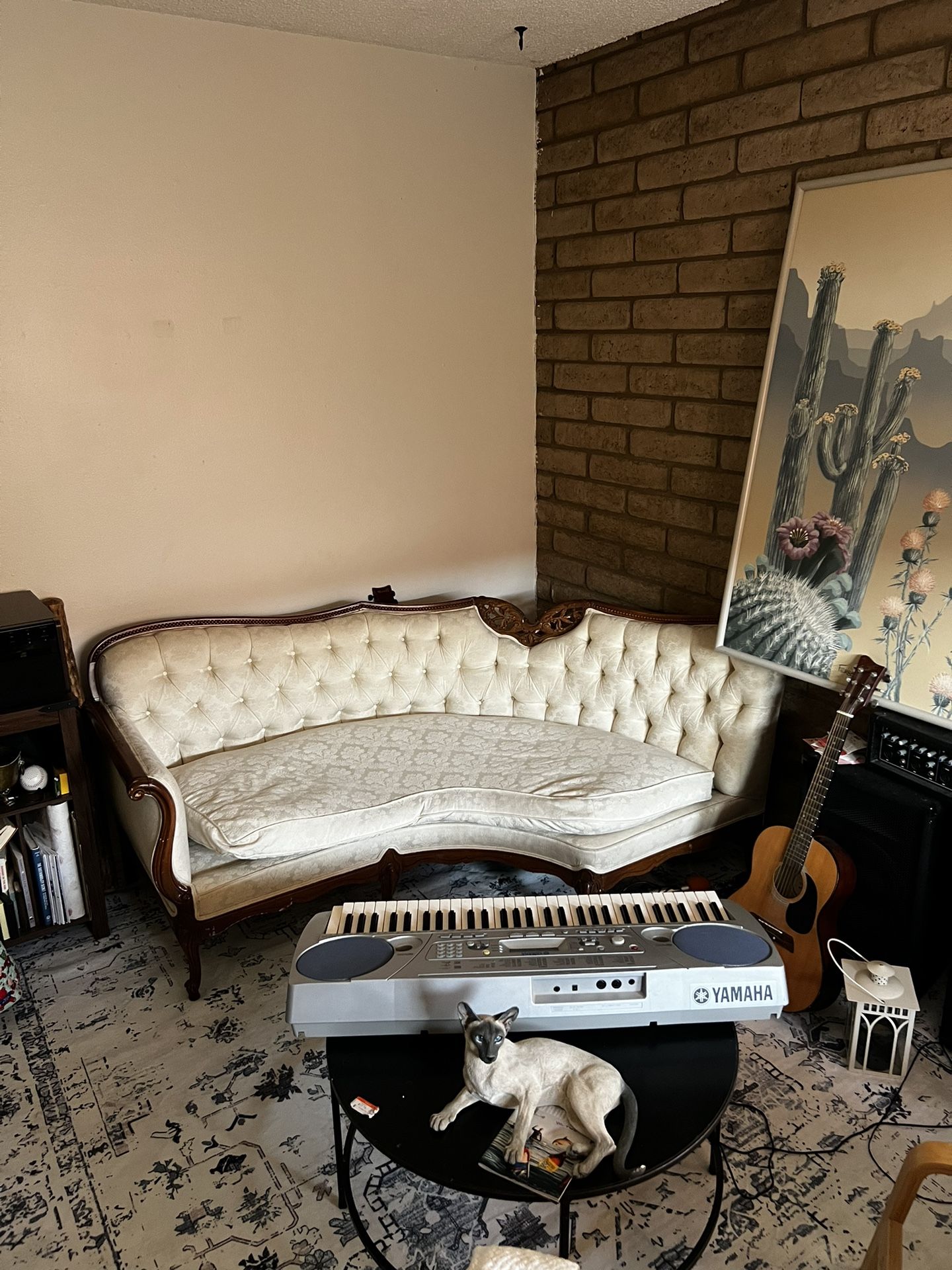 Bridal vintage couch, good condition, clean, cover comes off and was washed. Goose feather cushion.