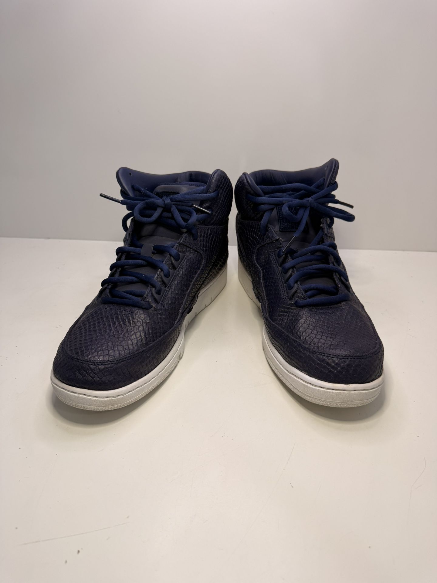 Authentic Nike Air Python SP sneakers (Style Code: 658394-400) in the Obsidian / White snakeskin-embossed leather. A luxury-inspired high-top silhouette that blends basketball heritage with premium detailing. Originally released in 2014. Size: US 11 / UK 10 / EU 45 / CM 29 Made in Vietnam UPC: 00(contact info removed)04 MSRP: $150 ⸻ Condition: • Excellent Pre-owned Condition • Uppers: Very clean, snakeskin texture crisp • Soles: Minimal signs of use • Interior: Clean, no odors • Includes: Original Nike box + extra factory-sealed white laces ⸻ Features: • Snakeskin-embossed premium leather upper • Classic retro basketball high-top silhouette • White midsole and outsole contrast • Padded ankle collar for support • Nike Air branding on midsole ⸻ Shipping: • Ships double-boxed for protection • Tracking included