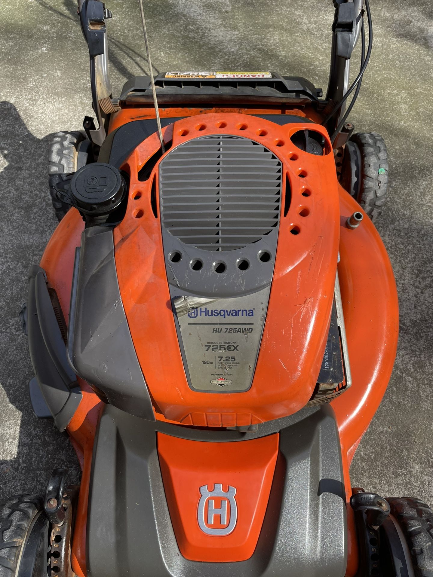 Husqvarna HU725AWD Lawn Mower. Husqvarna self propelled lawn mower with 7.25 EX engine. It has a new air filter and brand new blade. Cash only and no shipping.
