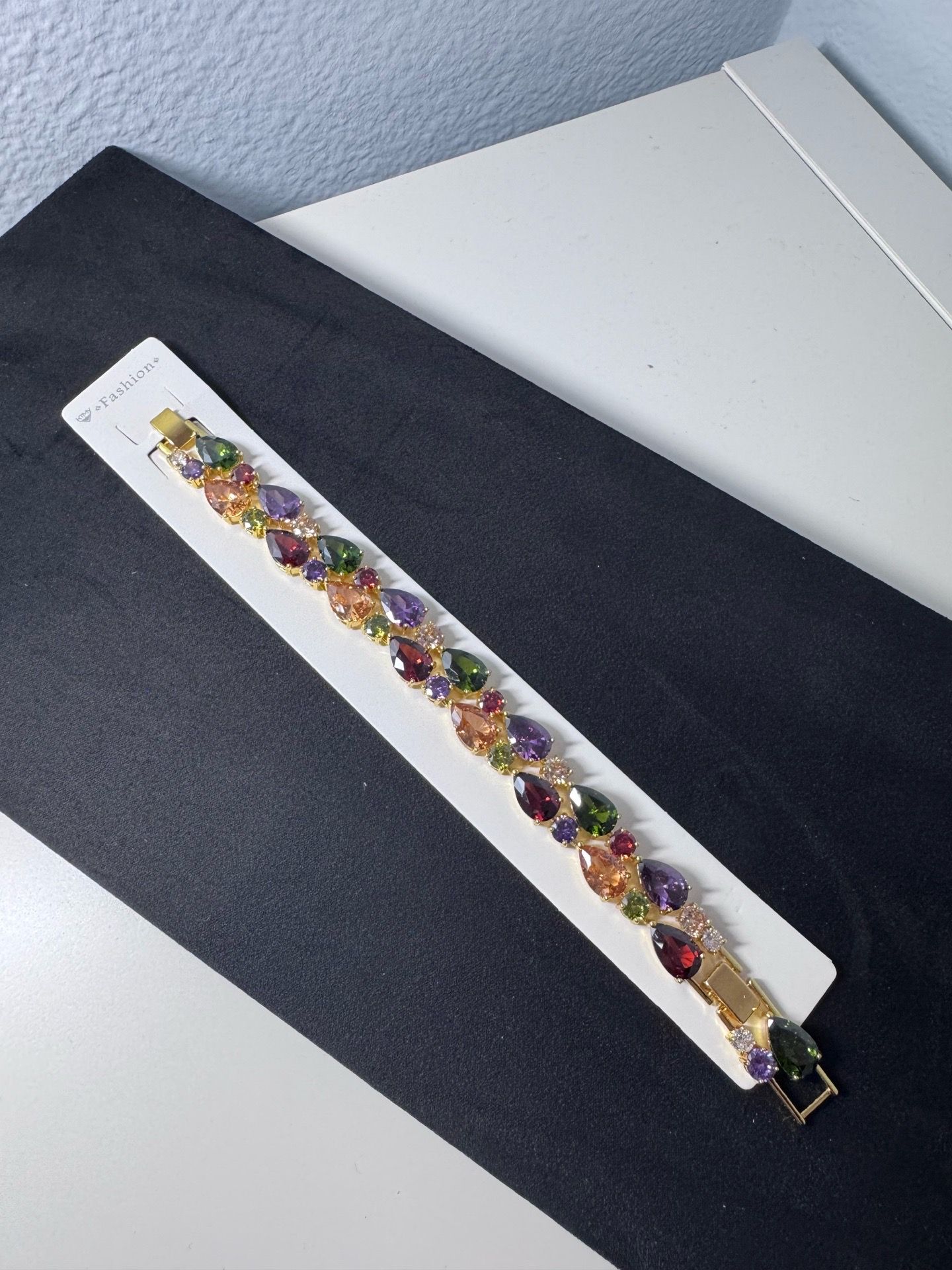 Vibrant bracelet has gold tone. Features pretty teardrop and round gemstones in colors like purple, green, red, and orange. Looks super cute!
