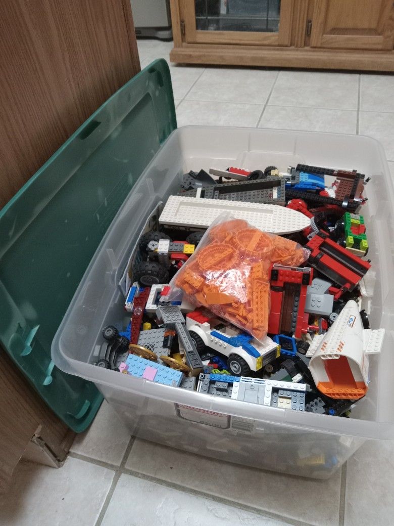 Large 58 quart Sterlite bin full of 100% real LEGO pieces (NO off brand pieces). No minifigures are included. It's very HEAVY!!! Lots of vehicles (with wheels)! LEGO pieces are undamaged, clean & odor free. Compare this bin to the others for sale, here, with inferior selection. The top holds on, securely.