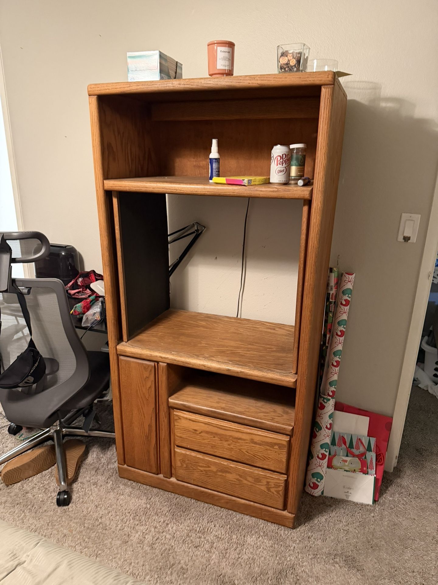 Old dresser armoire thing. It has a plug for a light on the top not sure if it works. I live upstairs and can’t help carry it down so you will need help. Free if you can get it today