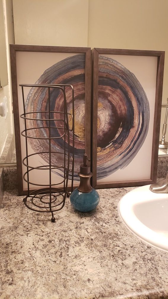 Selling these items because they no longer match my bathroom finish. Great for beach theme Size of wall art: 22"W x 21"H together as they are two separate pieces $30 obo
