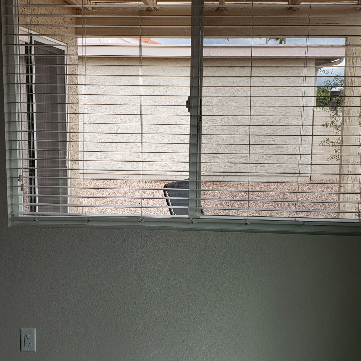 Faux wood horizontal blind measures 45 in. wide by 48 in long. Pristine condition