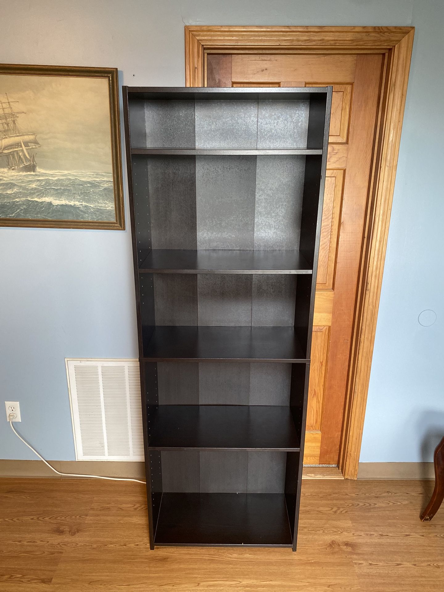 71” tall black wooden book case with 5 shelves Like new minimal wear. The measurements are in the pictures posted must be picked up in East Providence
