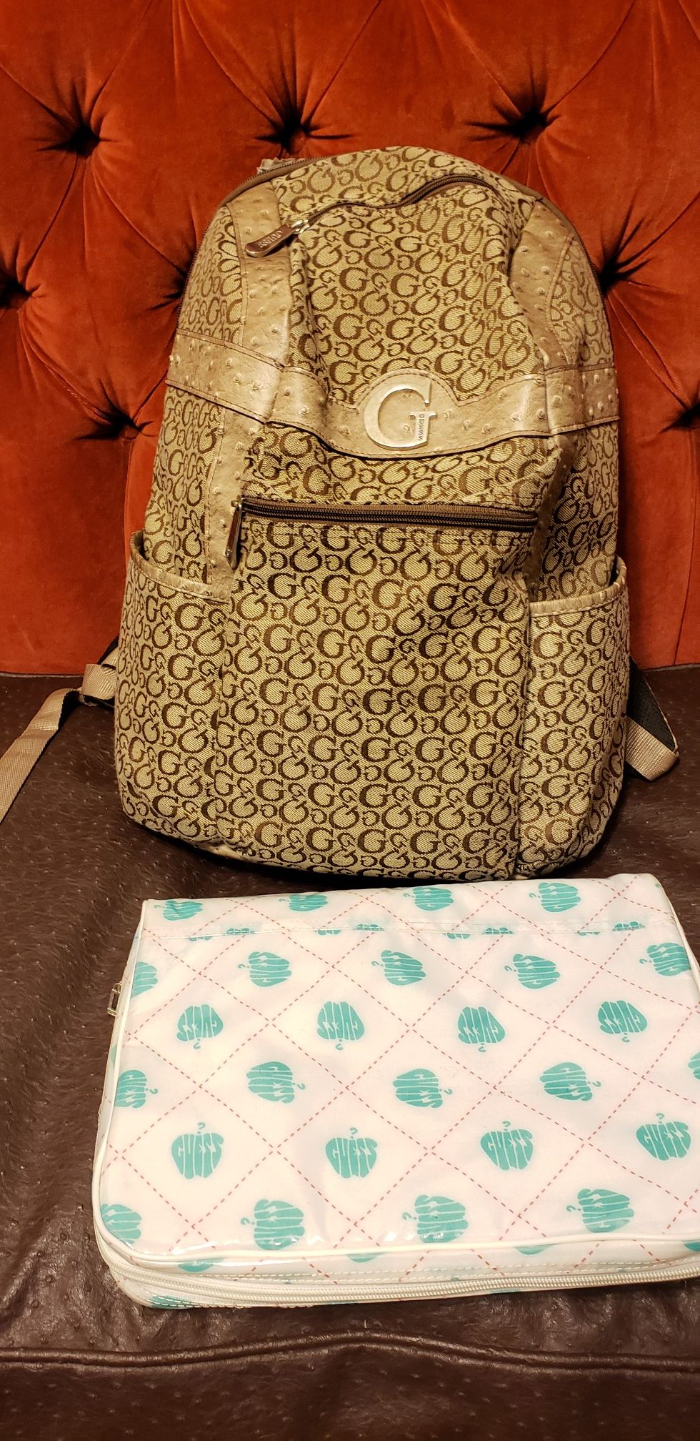 Guess diaper bag with diaper changing mat that also has it's own zip up pouch. Has tears on handle as shown in picture. Still in great shape.