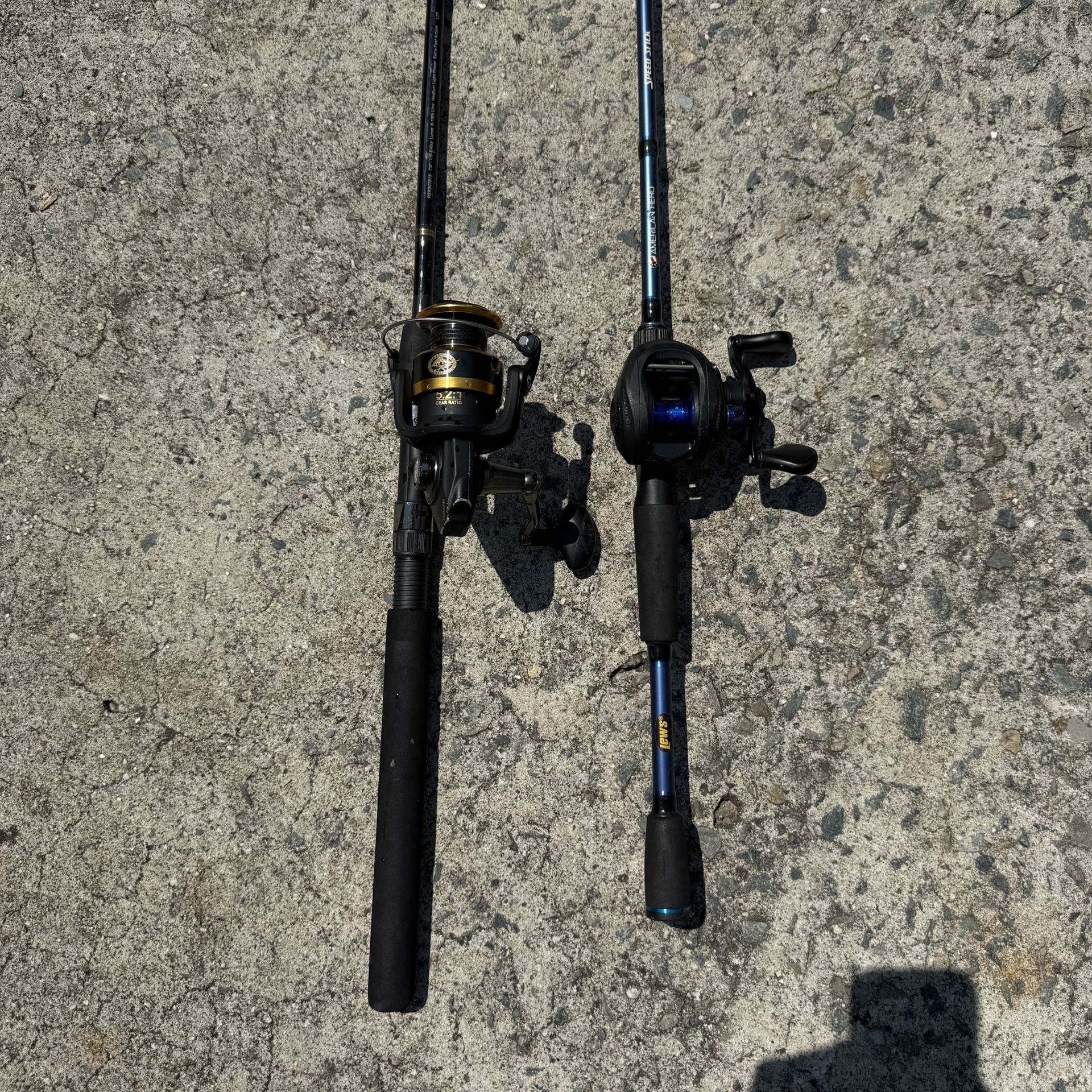 Lew's "American Hero" baitcaster combo and Frigate "Offshore Angler" spinning combo. All specs are pictured for both rods. Separate pricing is available but I am offering a better deal for the package. Please reach out with any questions or concerns.