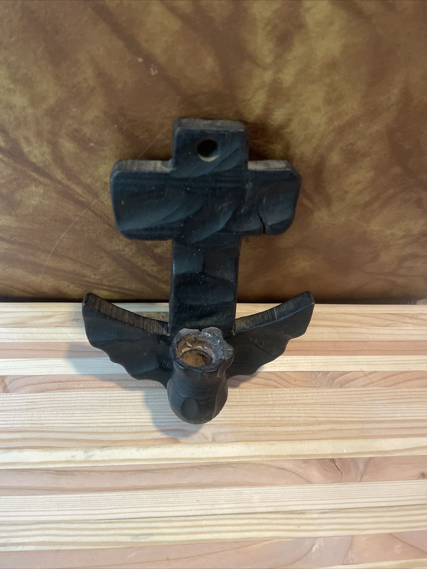 Vintage Wooden Anchor Candle Holder.. Hand made wooden anchor with a candle stick holder on the front. Mounting hole at the top center of anchor, this was hand crafted in Taiwan. Great for boat enthusiasts or themed room decoration.