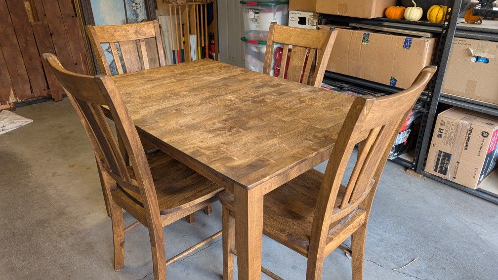 Solid wood dining set with table and 4 chairs. 32" D x 60" L x 29 1/4" H. When the butterfly leaf is tucked away, the length is 48". Great condition.