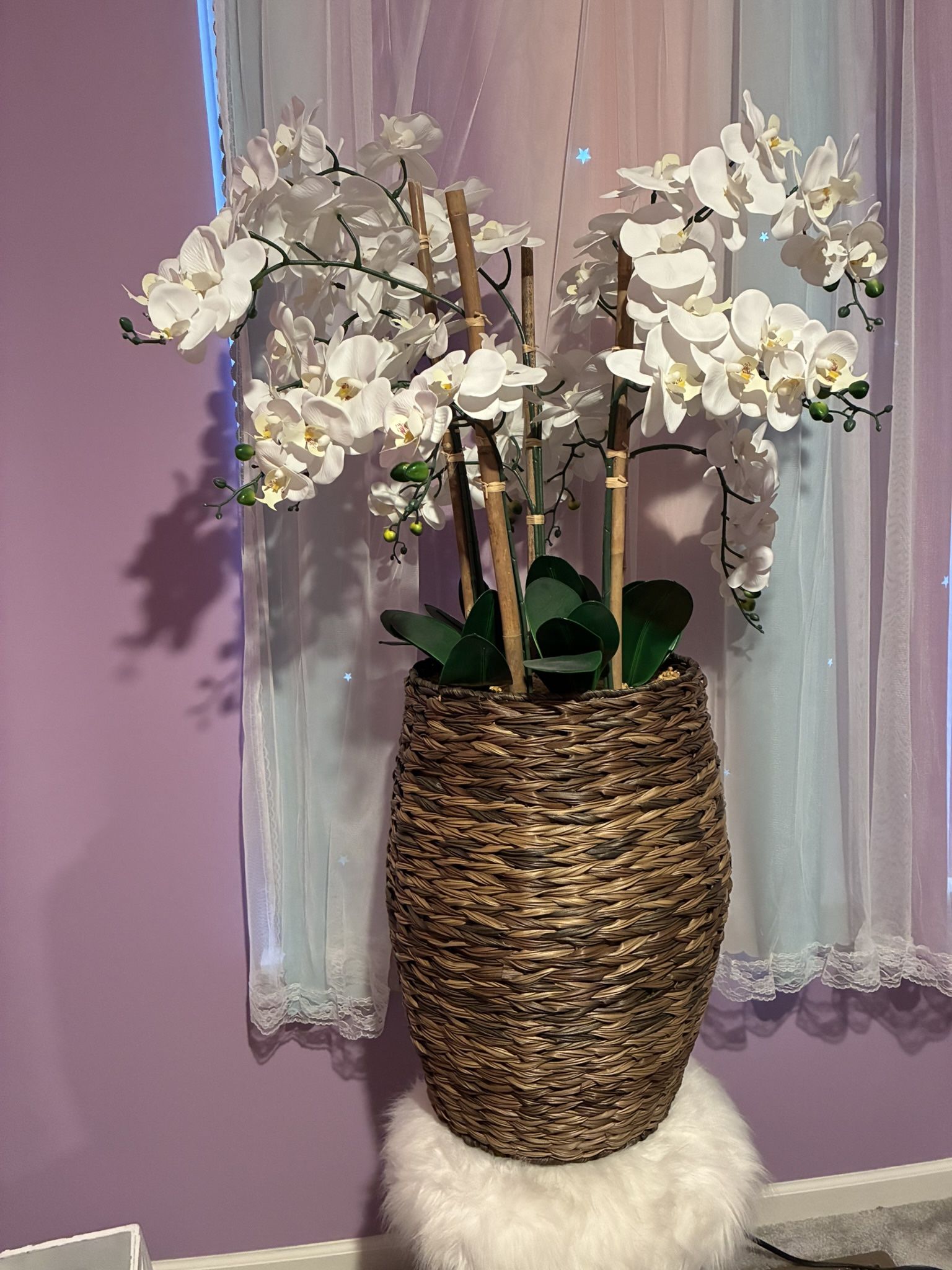 This is an artificial white phalaenopsis orchid plant in a woven basket planter