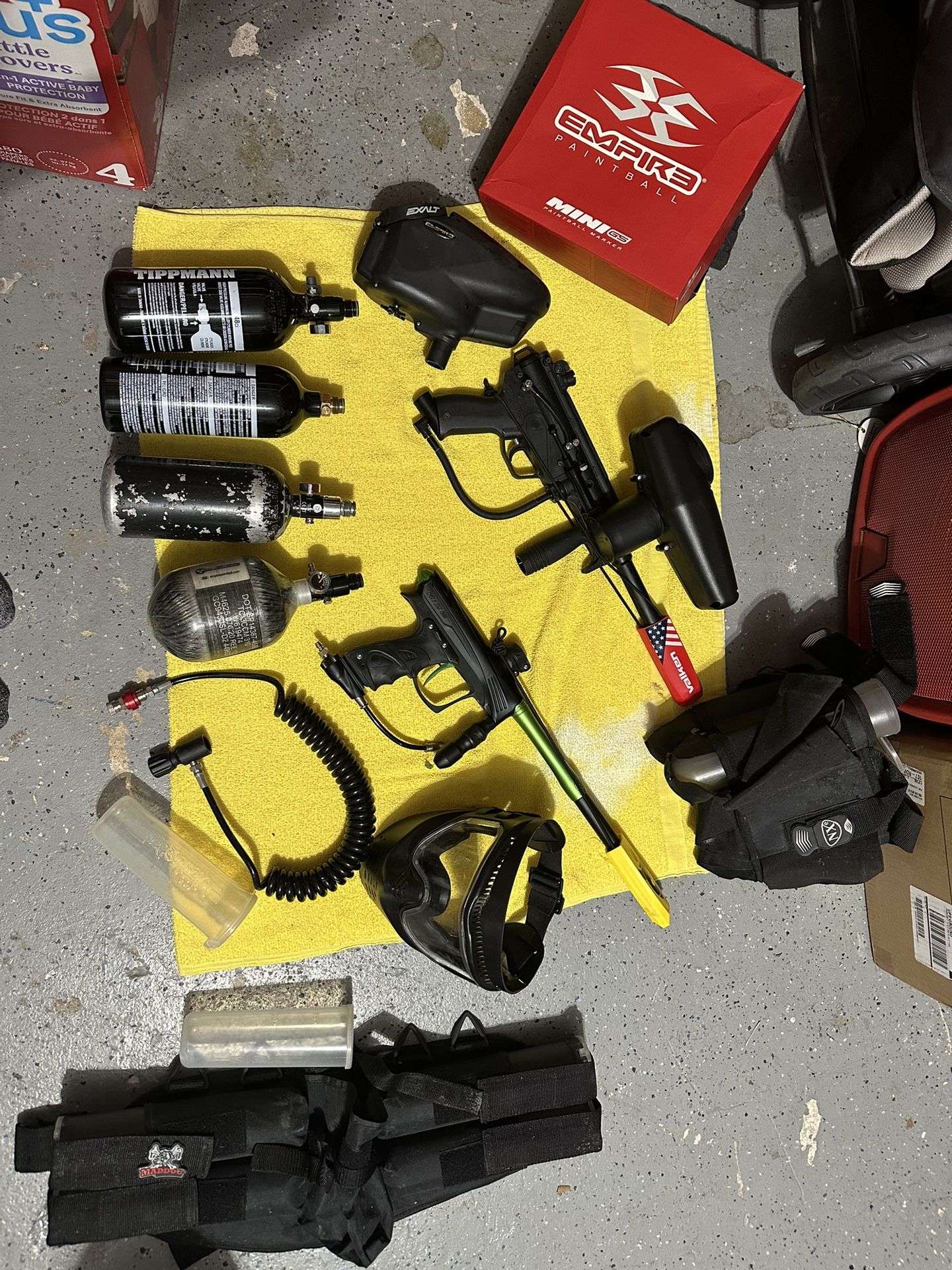 🔫 COMPLETE PAINTBALL GEAR LOT – READY TO PLAY 🔥 Everything you need to hit the field – great value bundle! Selling a full paintball setup with multiple markers and accessories. Perfect for beginners, weekend players, or anyone looking to upgrade or have backup gear. This is a bundle deal – not looking to separate at this time. ✅ WHAT’S INCLUDED: • 2 Paintball Markers • 1 electronic-style marker • 1 mechanical-style marker • Empire Paintball Hopper (high-quality, reliable feed) • Multiple Air Tanks • Several CO₂ tanks (various sizes) • 1 carbon fiber air tank • Paintball Mask / Goggles (full-face protection) • Pod Harness / Vest • Paint Pods • Remote Air Line • Empire Paintball Box (great for storage/transport) 💥 CONDITION: • Used but well cared for • Normal cosmetic wear from play (no major damage) • Stored indoors • Great starter or backup setup 🎯 WHY THIS IS A GREAT DEAL: • Saves you hundreds vs buying separately • Ideal for recreational or field play • Multiple markers = bring a friend or keep a spare • Trusted brands (Empire, Tippmann, etc.) 📍 Local pickup preferred 💰 Priced to sell – reasonable offers welcome