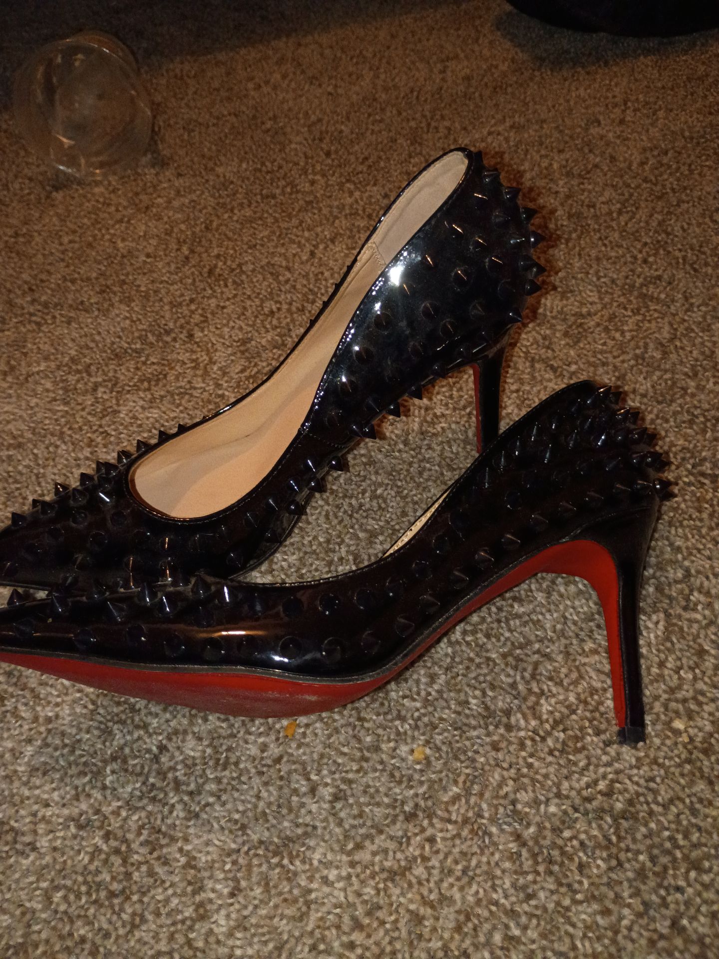 This pair of Christian Louboutin Spike Heels, in a sleek black patent leather, are a statement of bold elegance. The shoe is entirely covered in signature Louboutin spikes, giving them a distinctive and edgy look. The classic pointed toe and slender 10 cm heel create a sophisticated silhouette synonymous with the brand. Featuring the iconic Louboutin red lacquered sole, these heels are instantly recognizable and exude luxury. The interior is lined with a smooth beige leather, ensuring a comfortable fit. Presented in excellent condition, this size 38 pair is a coveted addition to any high-fashion footwear collection. Christian Louboutin Spike Heels in black patent leather Size: 38 All-over spike embellishment Heel length: 10 cm Iconic red lacquered sole Excellent condition Elevate your style with these iconic and fierce Christian Louboutin spike heels.