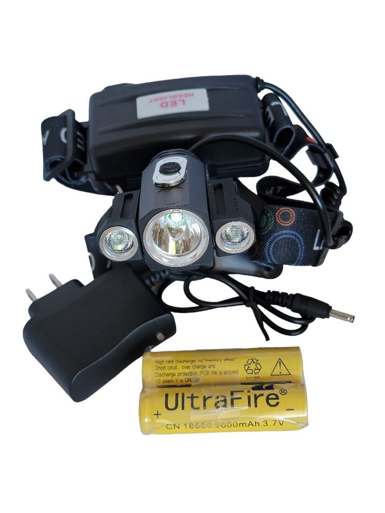 3 white LED beams with 4 modes + flashing Rechargeable UltraFire CN 18650 battery (9800mAh, 3.7V) Adjustable frame Waterproof design This LED light offers versatility and reliability with its multiple modes, rechargeable battery, and durable construction.