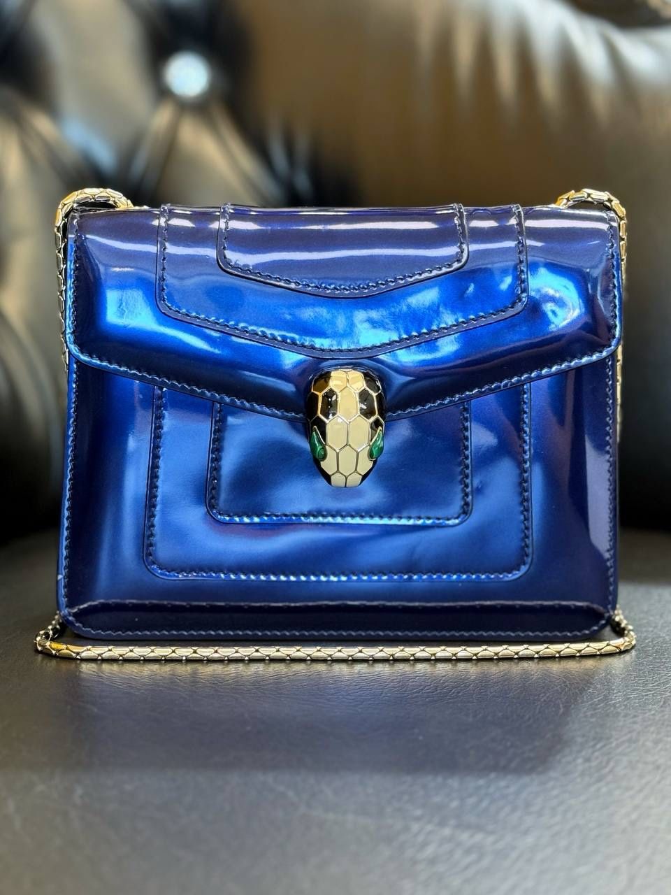 Bvlgari Serpenti Forever Square Crossbody Shoulder Bag Brushed Metallic calf Royal Sapphire Leather Receipt & Mirror