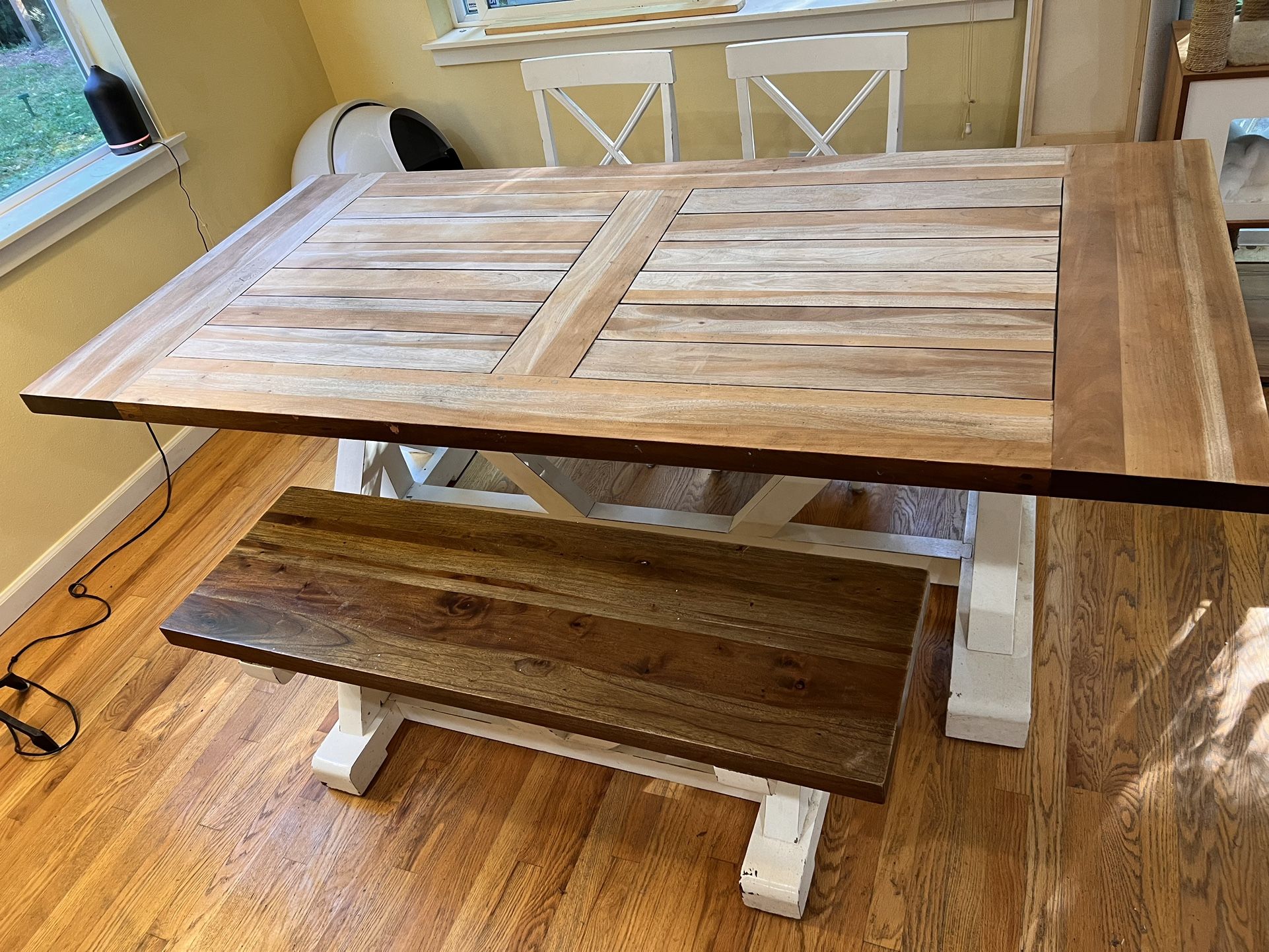 Heavy duty 7ft table from Bramble. Comes with a matching bench seat and 2 chairs