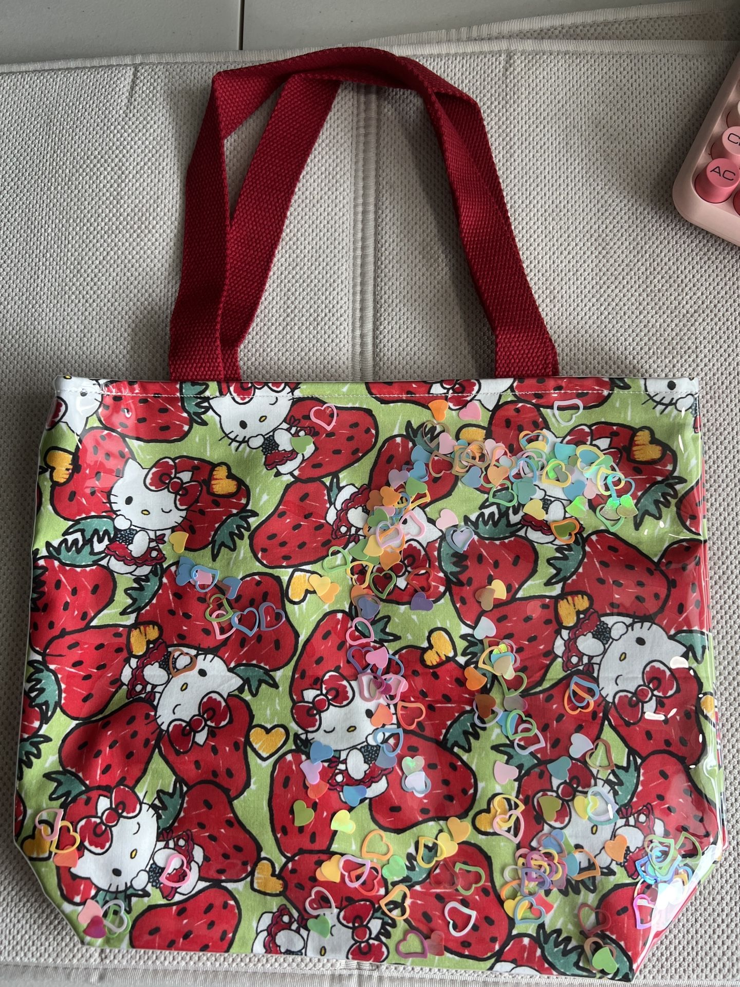 Double layered bag with glittered decor beside the two layers. Very cute and great quality. 11.5in x 8.5in x 3in