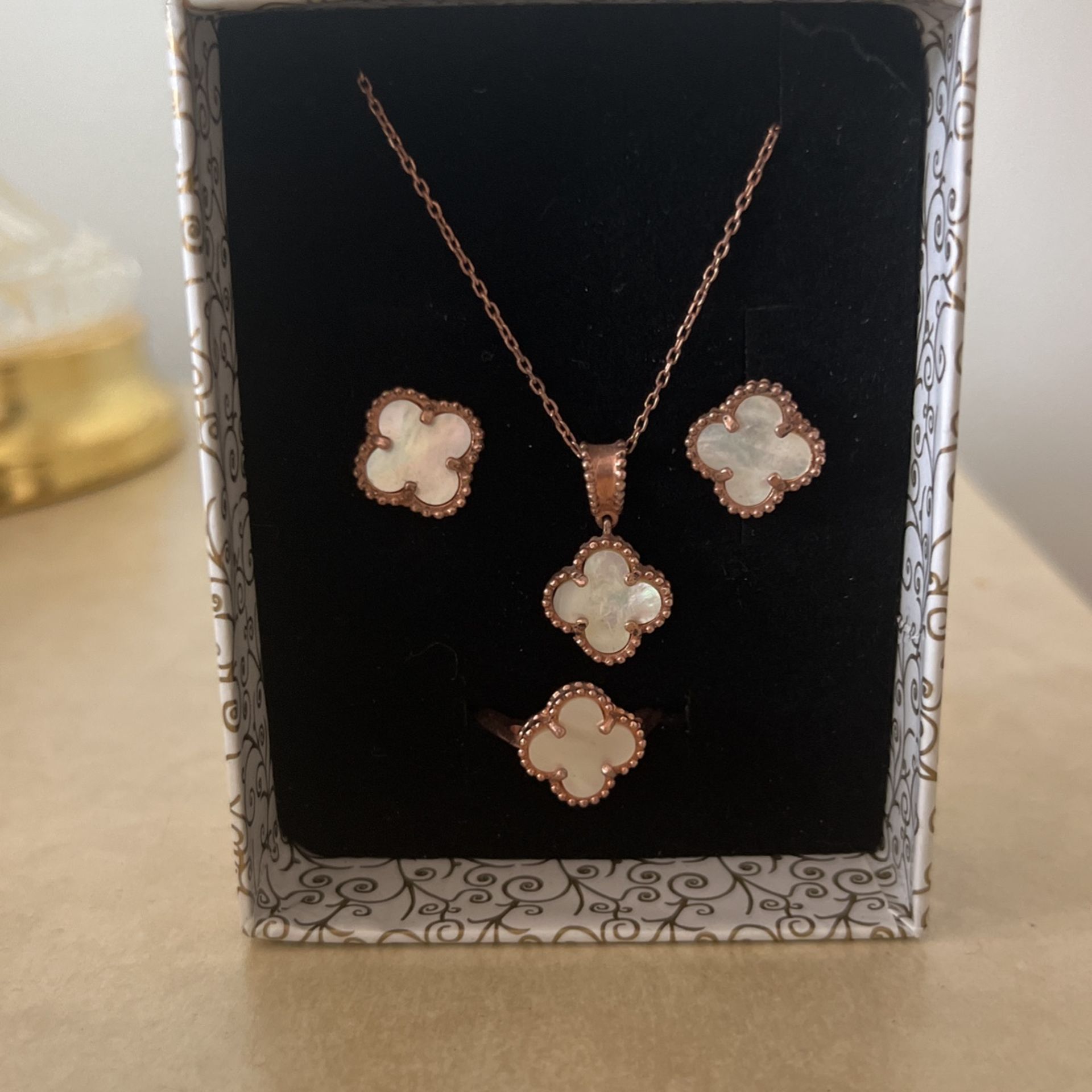 White colver four leaf 3 pc set . Necklace, earrings and ring