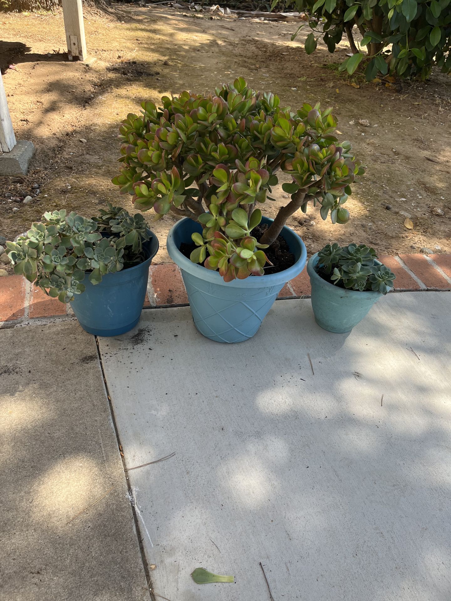 Three potted succulent plants, small medium and large great for indoor or outdoor. These are the best types of plants as you cannot water them for a few weeks and they still survive.