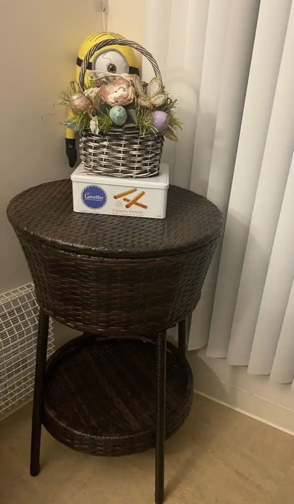 End Tables with Storage Round Basket Living Room Storage Side Table with Storage It can be placed in the corner of the living room as a decoration, and other stuff that you need can also be placed in the storage. Very good condition Actually, it just has been placed in the corner of the living room since I bought it. Looks very new.
