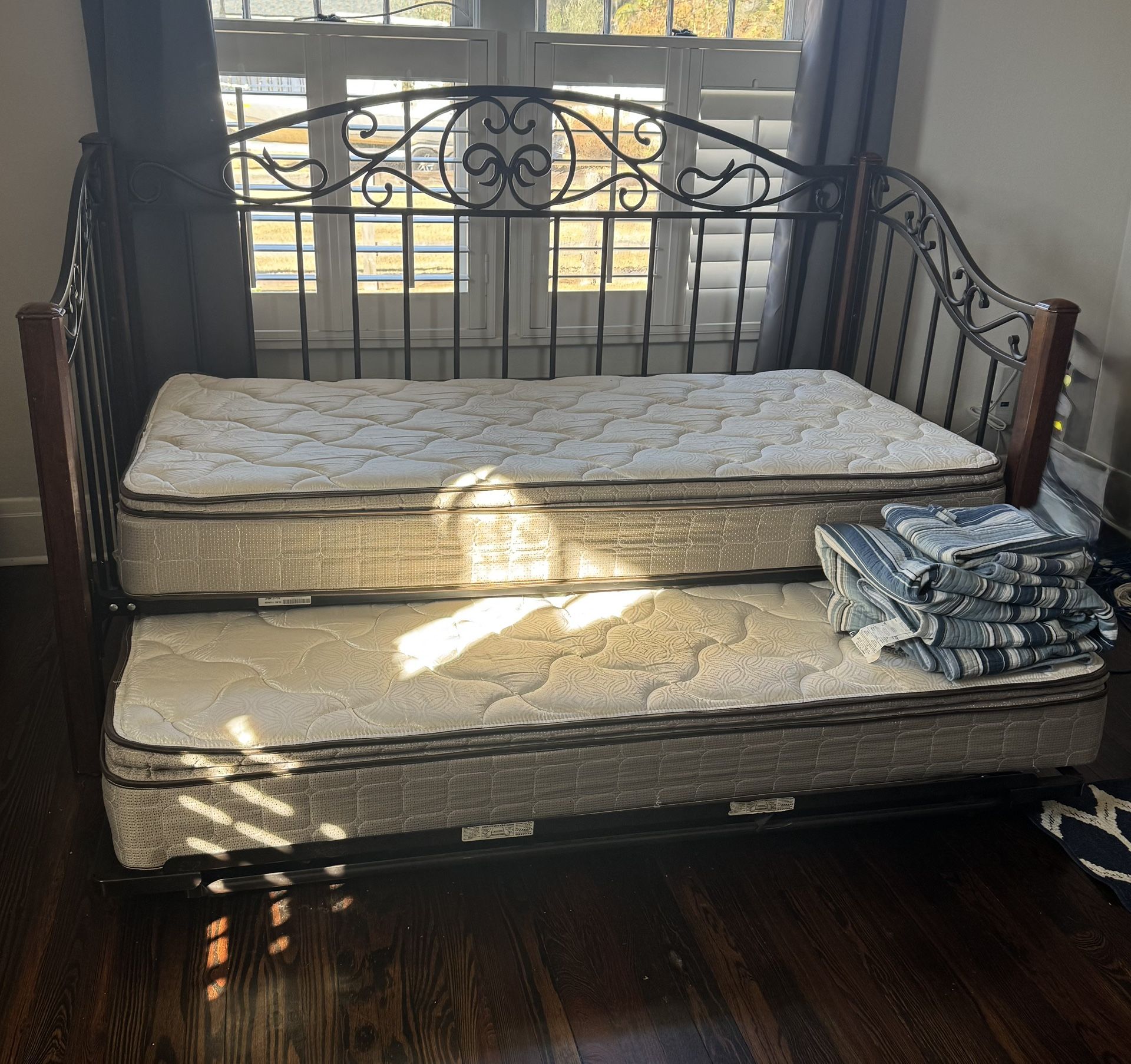 Used trundle day bed, excellent shape, both mattress are pillow top twins and combined will be a queen, used day bed comforter as well