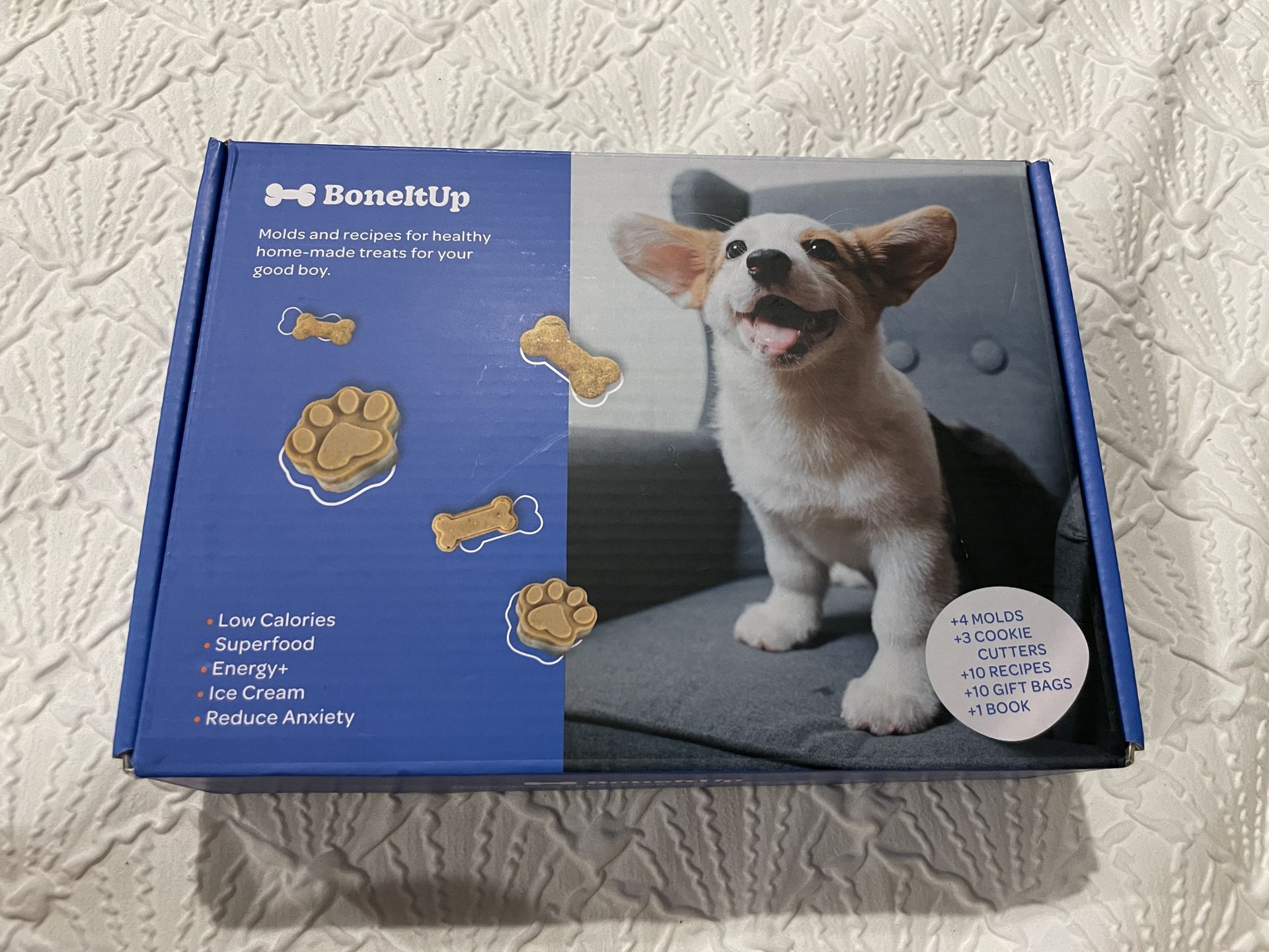 New & Unused. BonetUp dog treat mold set with bone and paw shapes. Includes molds and cookie cutters. Perfect for homemade dog treats.