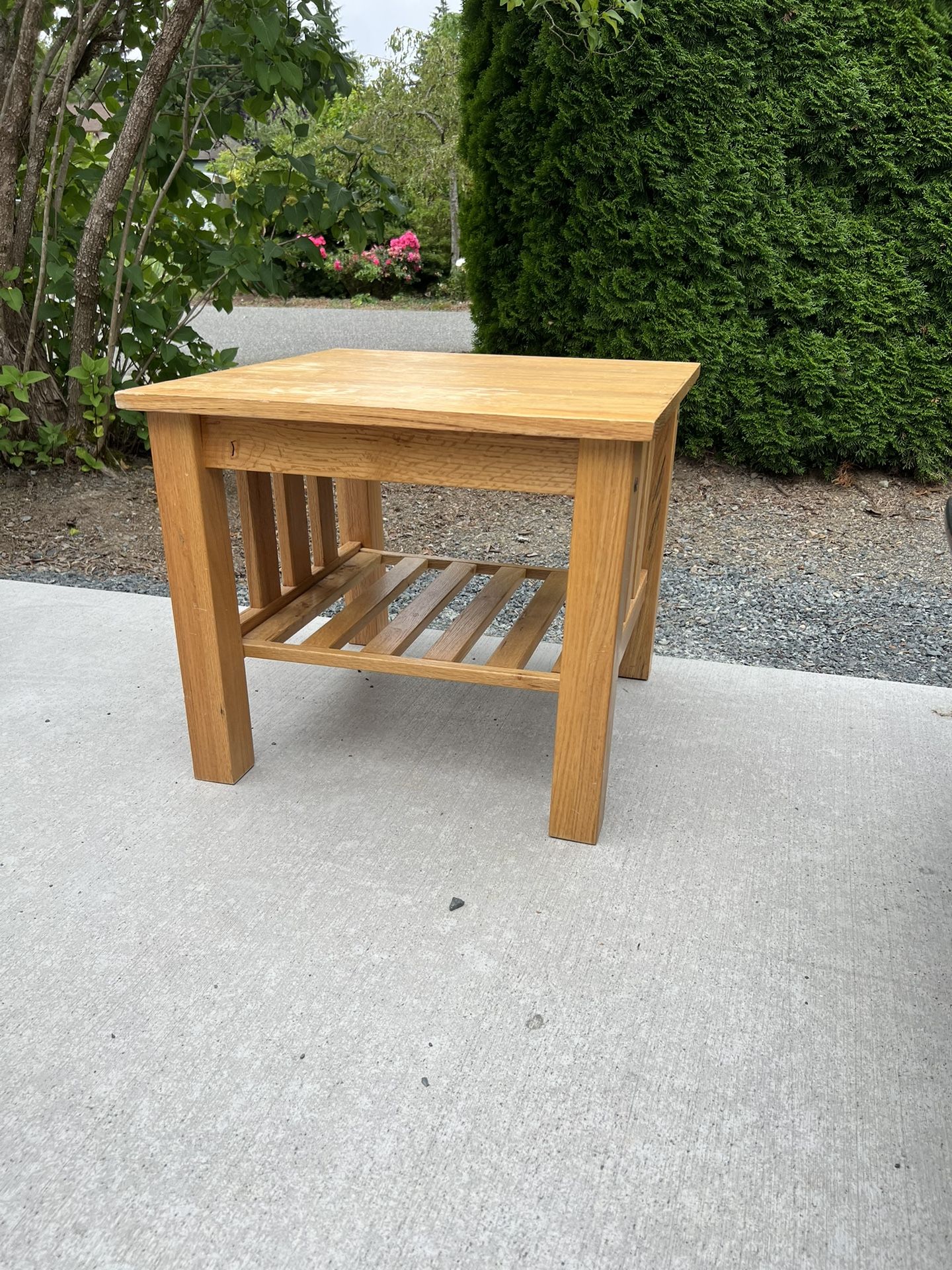 Excellent end table! Made of sturdy wood. Minimal scuffs and marks. Needs a new loving home!