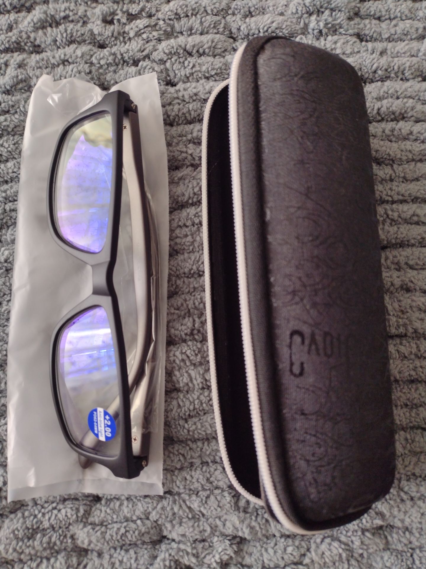 New reading glasses, +2.00, in a compact sturdy case.
