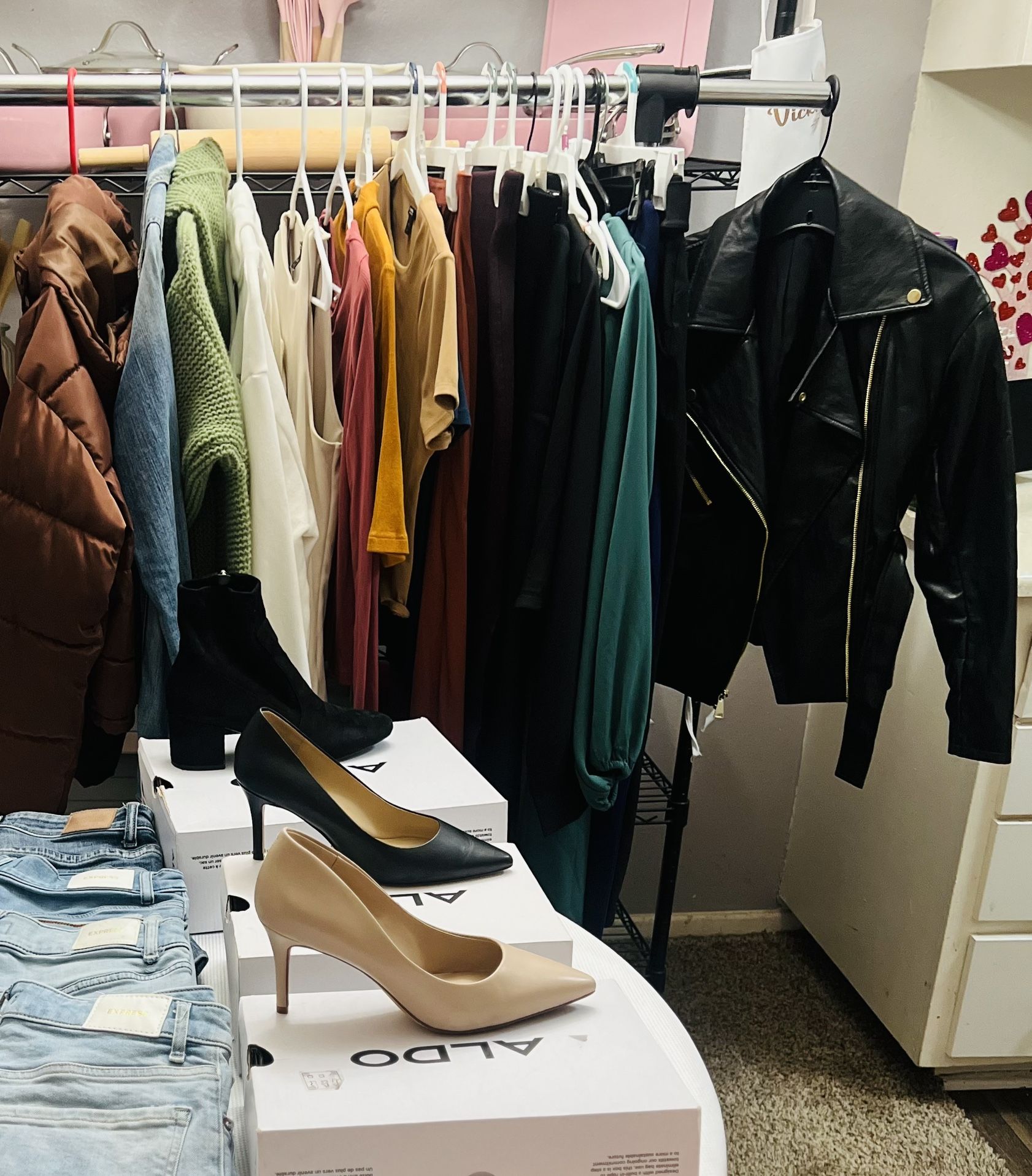 Women’s clothing, 30 Items total, 9 Express jeans sizes 4-6 , 3 Aldo’s shoes size 8, 2 express jackets, 1 Hollister Jean jacket, 1 Hollister sweate