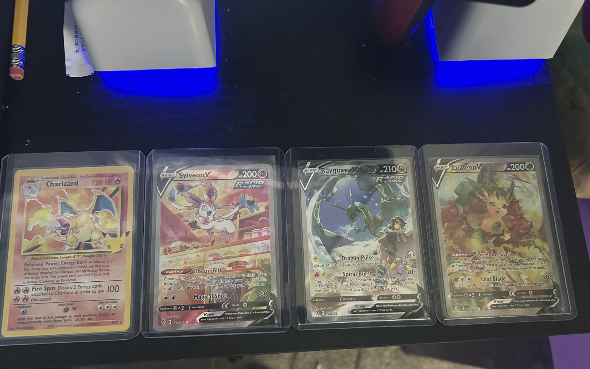 3 cards from Evolving skies Rayquaza V -200 Leafeon V -100 Sylveon V -100 Celebrations Charizard-75 Heart gold DS( no Walker)-80