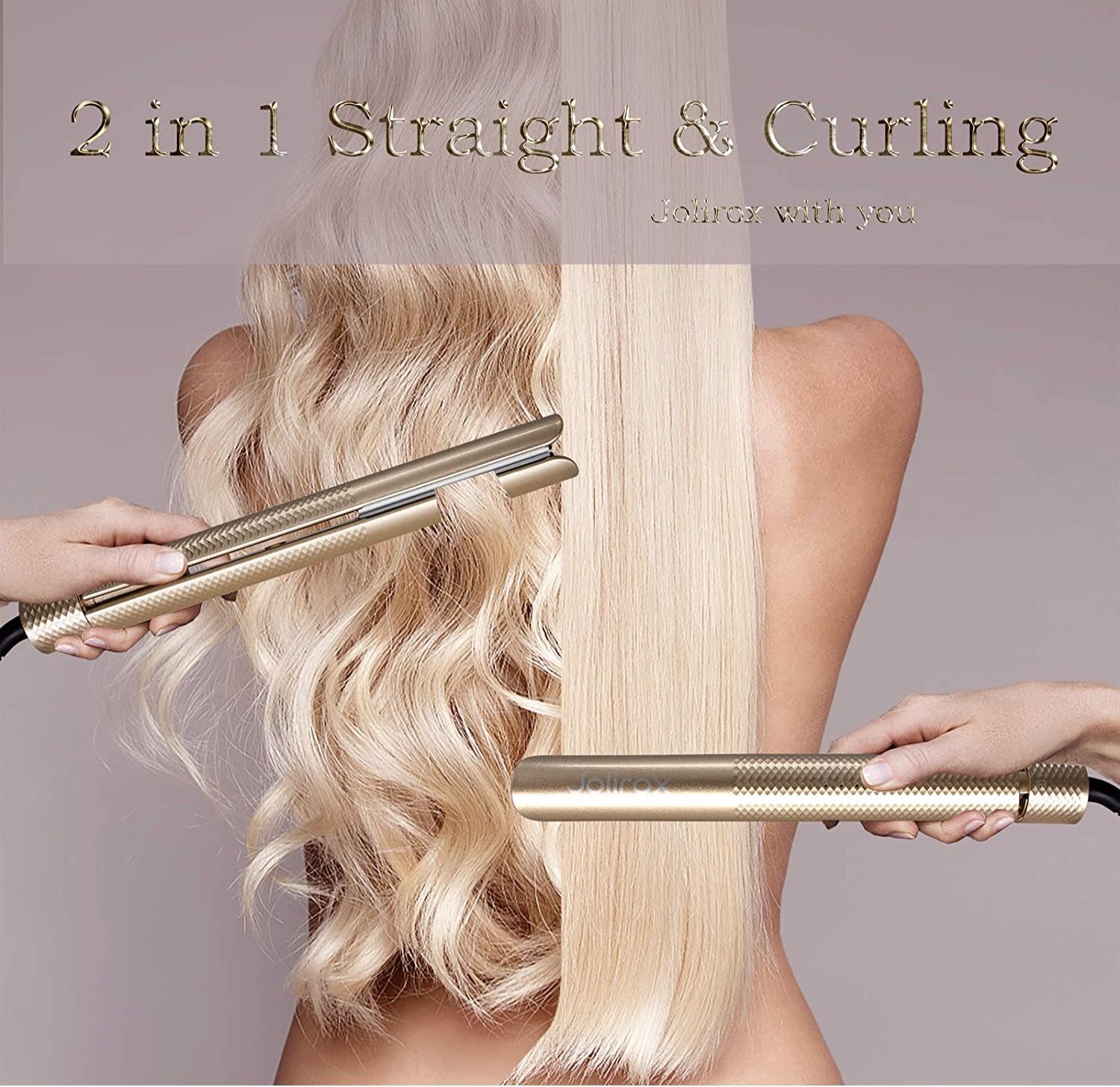 Titanium Hair Iron, Straightener and Curling Iron in one, Tourmaline Ceramic Flat Iron, Round Rotating Straightening Curler 1 inch, Travel Iron Dual Voltage, Auto-Off (Champaigne Gold)