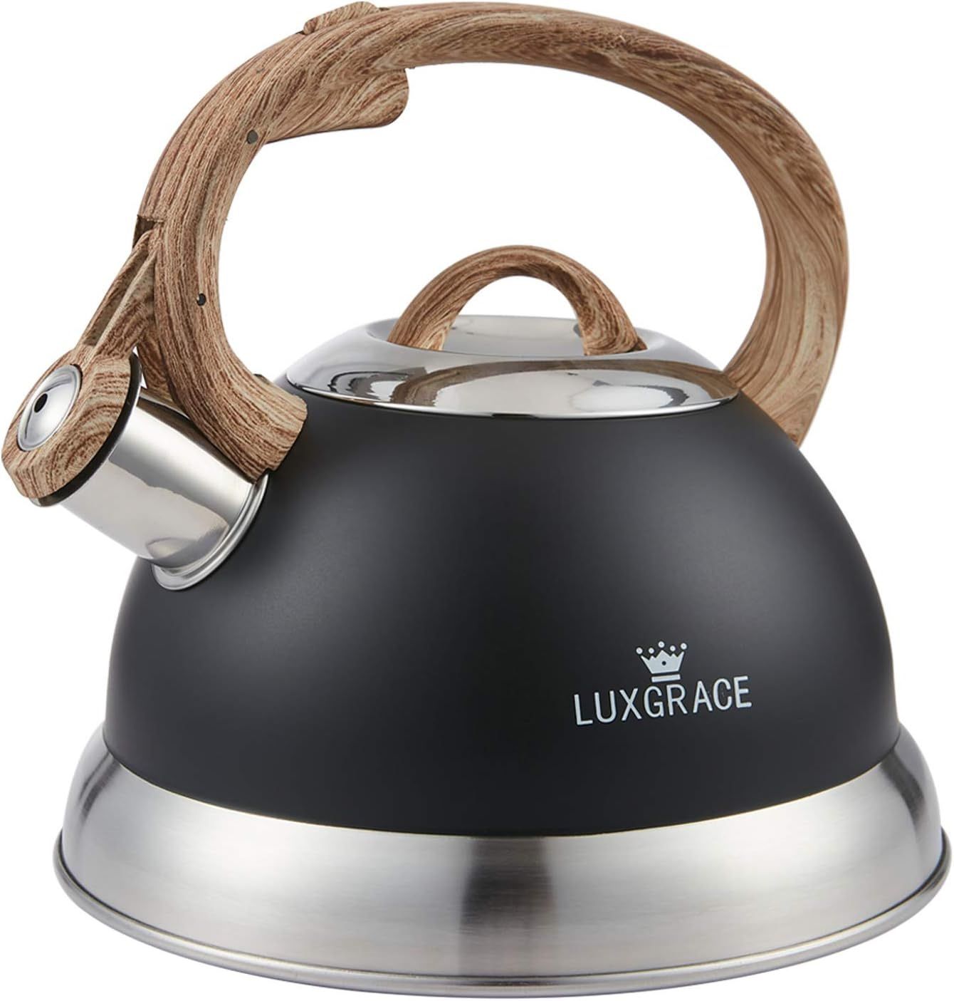 Material: High-quality, anti-rust stainless steel (PFOA-free and non-toxic according to the previous description). Capacity: 2.3 quarts, suitable for family use. Boiling Indicator: Loud whistle that automatically emits when the water is boiling. Safety Features: Heat-resistant lid and handle. Simple touch button or trigger mechanism on handle to open and close the spout lid safely, avoiding scalding. Other Features: Heats up quickly and retains heat well. Encapsulated bottom for even heat distribution. Convenient one-finger flip spout for easy and safe pouring. Removable lid for easy filling. Compatible with various stovetops (gas, electric, induction, halogen, and radiant). Cautions: Clean before use. Do not heat an empty kettle. Keep the flame on a gas stove under the kettle bottom, not burning the sides. Do not fill water above the spout to avoid overflow and ensure the whistle functions properly. Even though the handle is heat-resistant, use caution when lifting the kettle. Consider using a potholder. Overall, this LUXGRACE kettle seems like a versatile and user-friendly option for stovetop tea boiling. It prioritizes safety with heat-resistant features and a convenient pouring mechanism. The larger capacity (compared to the 1.8 qt version) might be ideal for bigger households.