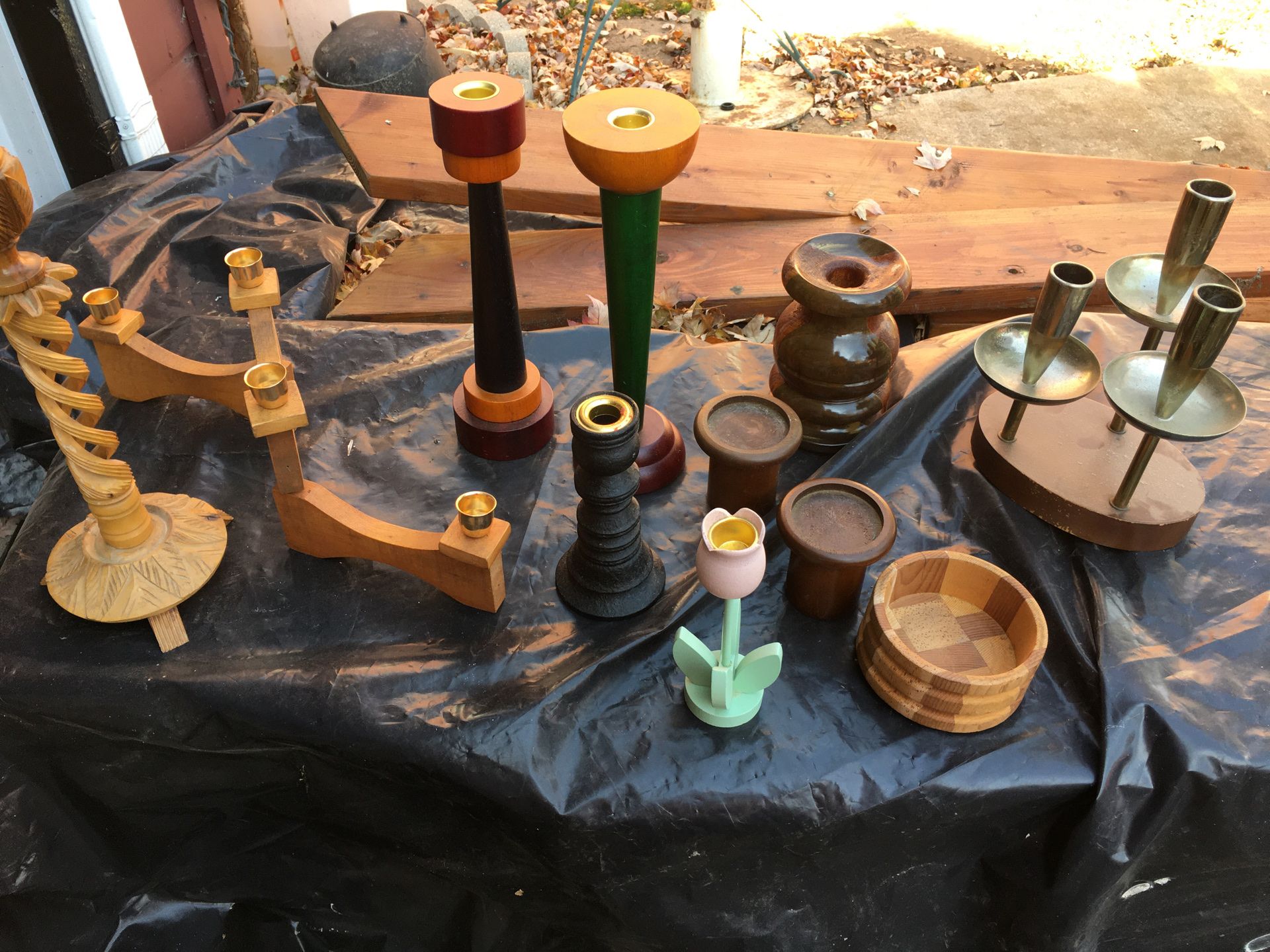 Eleven candleholders , various sizes and shapes. All made from wood, some with brass accents. Price is for all.