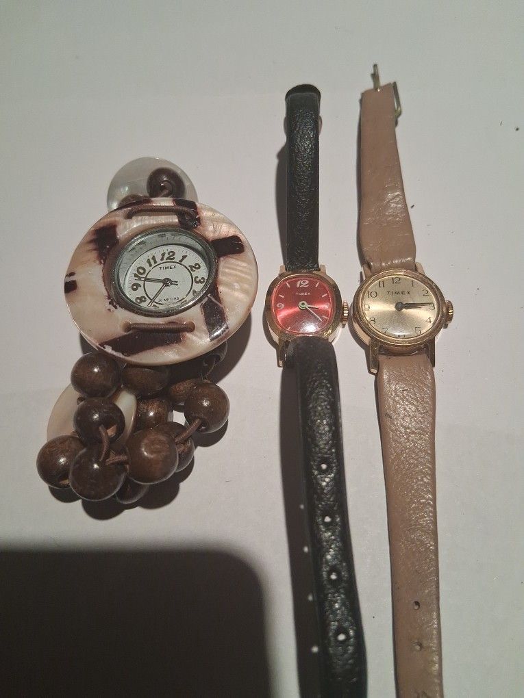 2 of them need bands. The black band one looks good and delicate. These are vintage watches. I have not tested these watches. I have no reason to think that they shouldn't work. Price reflects any flaws. This is an affordable used watch lot that has not been tested and shows some sort of wear, micro-scratches. Let pictures describe the item too. Please click on my profile to go to my page to see more unique items and a wide variety of vintage collectibles. From jewelry to jerseys and hot wheels to fine China. Make an offer, you won't know unless you try.. Please feel free to ask any questions, even on items that have been on my page for years. Still available.