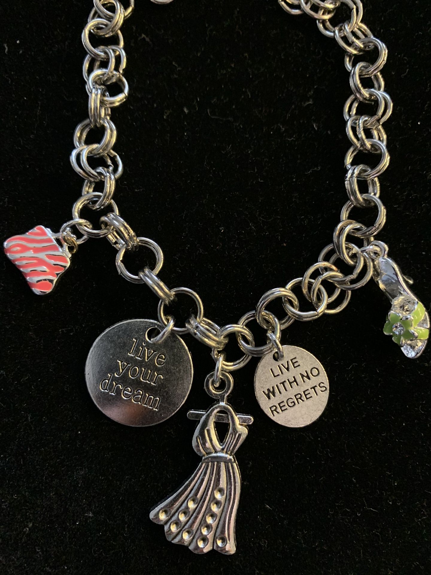 Live your dream with no regrets charm bracelet a very unique custom made piece. Bracelet features halter dress, enamel slip on heel, Enamel Purse and live your dream with no regrets Charms. All materials Silver Plated with Enamel and antique silver. Silver Tone double link chain 10 inches. All nickel and lead free. No returns.