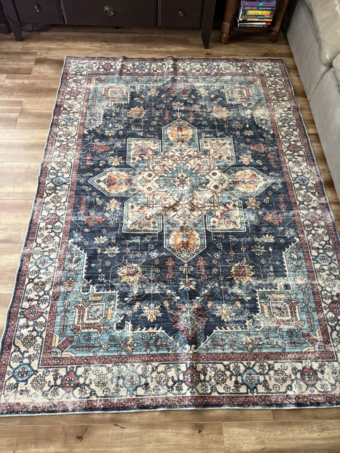Thin, low-profile area rug with a distressed vintage/Persian style pattern. Lightweight and easy to vacuum. Good used condition with normal wear. Low pile / flat feel Neutral blue, cream, and rust tones Works well in living rooms, bedrooms, or under furniture where thicker rugs don’t fit. I’m off 595 and Hiatus rd. Zip 33324.