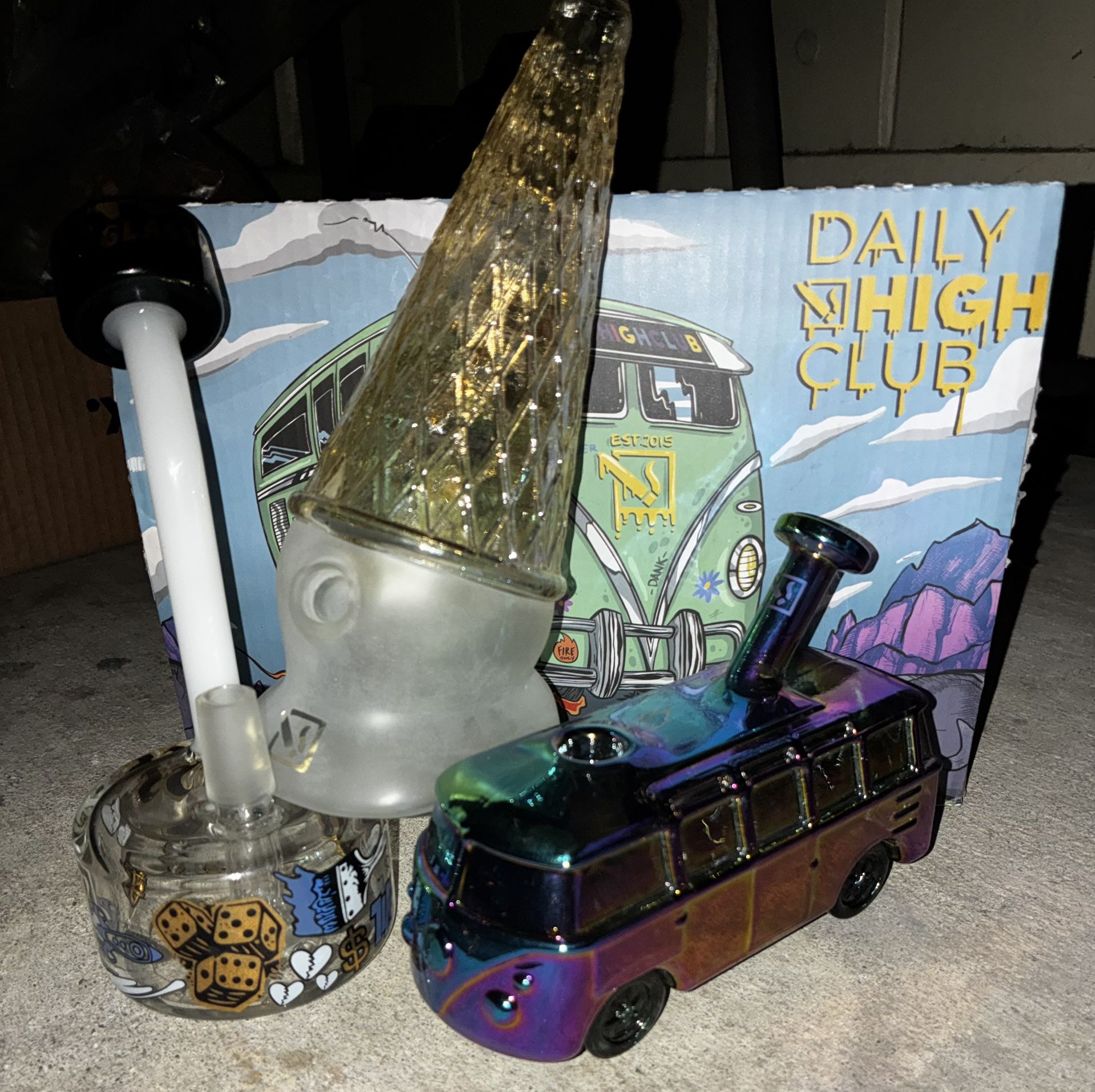 Three 6B Glass x Daily High Club Resin and flower cannabis water rigs VW Mystery Van $20 Exotic Sunday Cone -$30 EviLive Trip -$35 Resin or flower bowls $8 each