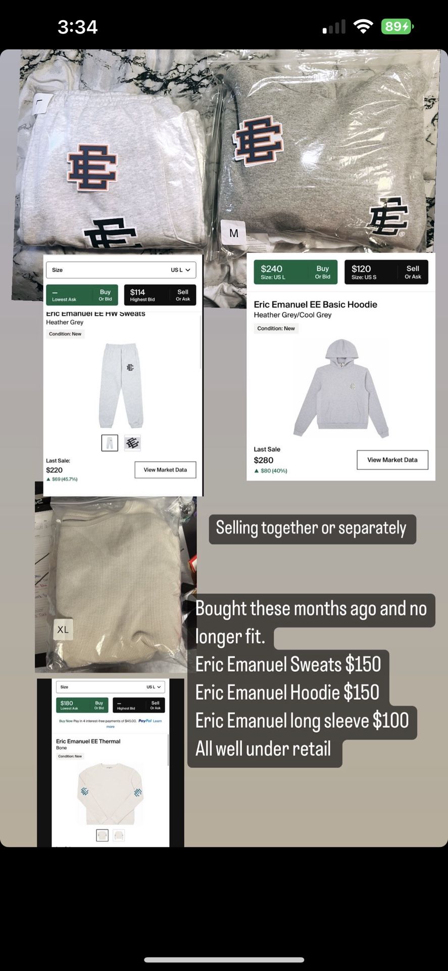 Lost some weight and they no longer fit. All are only tried on. Original package/ receipt/ stickers Hoodie- medium Sweats- large Long sleeve- XL