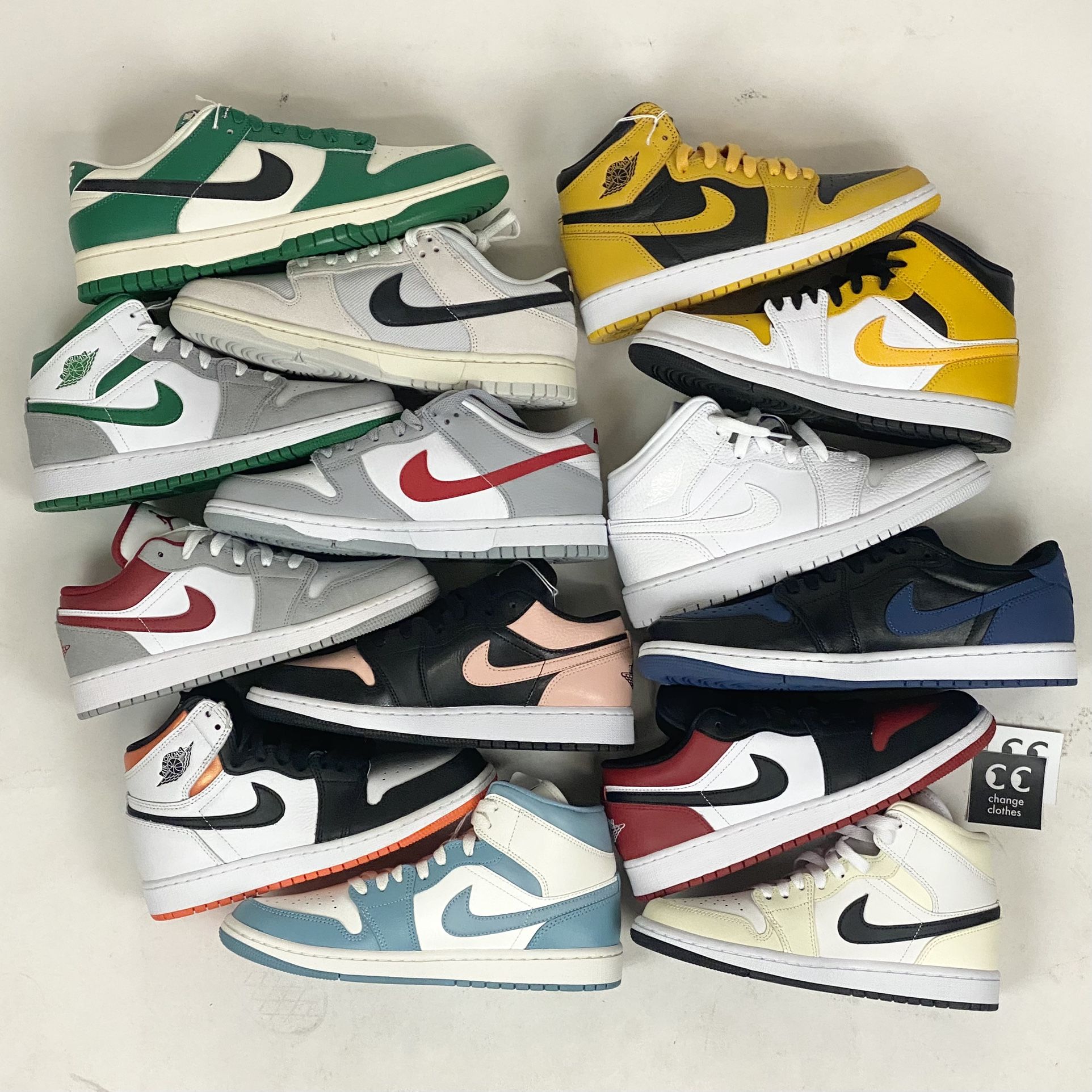 nike dunk low and jordan 1 low mid high assorted colorways lottery photon dust bred coconut pollen white unc crimson