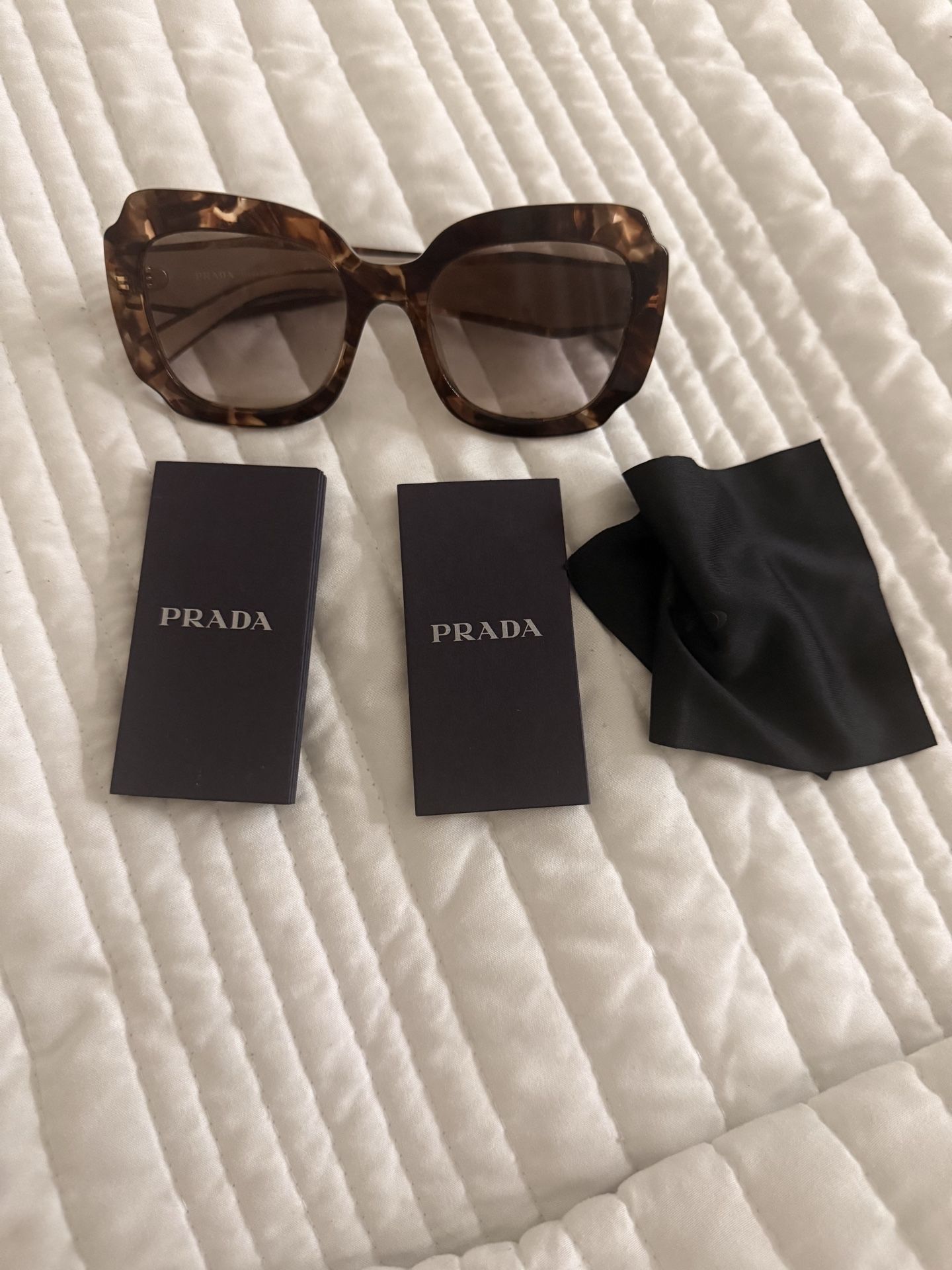 Beautiful brown Prada sun glasses original brand with cream color on the side no scratches no cracks in very good condition comes with a white case very elegant for any occasion