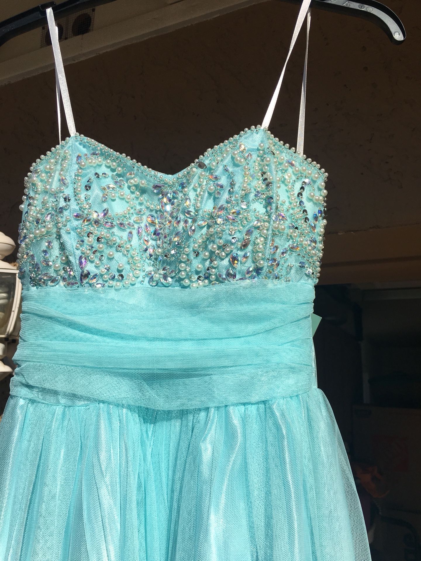 Aqua floor length dress. Tulle bottom. Quinceañera perfect! Never used my daughter changed her color choice.