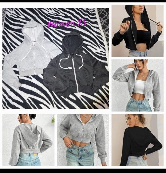 Super cute crop top hoodie. Shein Stylish cropped hoodies for women. Comes with one black and one grey hoodie. Features a drawstring hood and full zipper. Perfect for casual wear. Excellent like new clean condition. Women X-Small XS Smoke-free home. Bundle and Save.