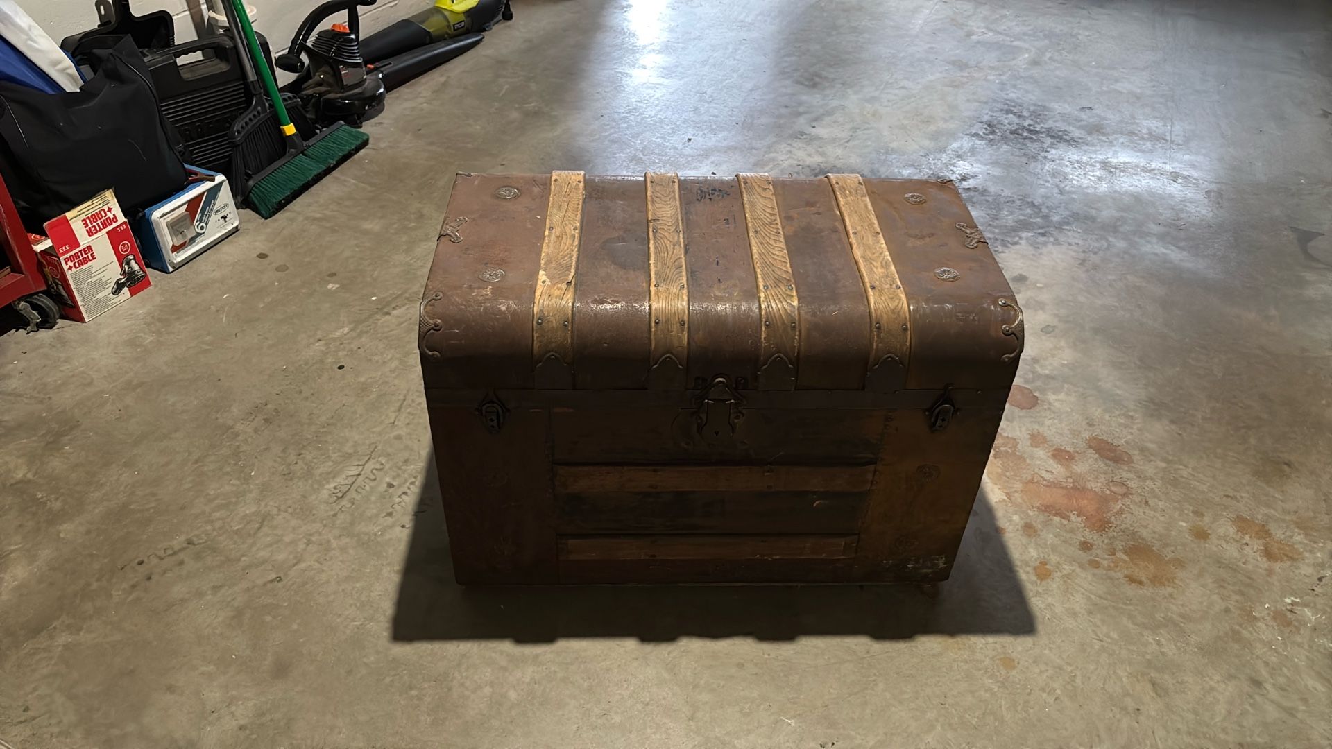 Antique Trunk. Inside is all original. Leather handles are broken. Flat top but rounded at front and back.
